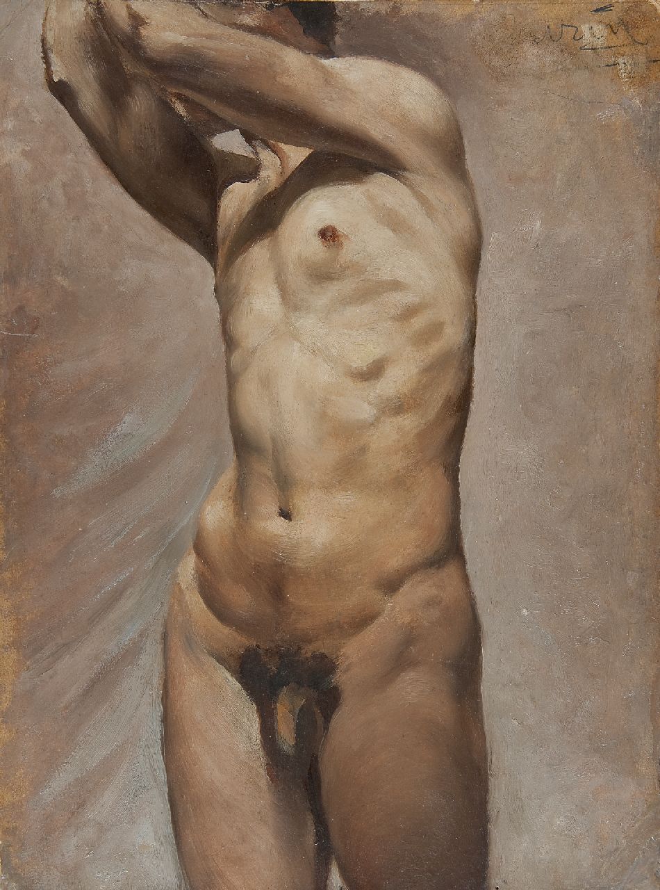Franse School kunstwerk • schilderij • voorheen te koop Academiestudie: staand mannelijk naakt