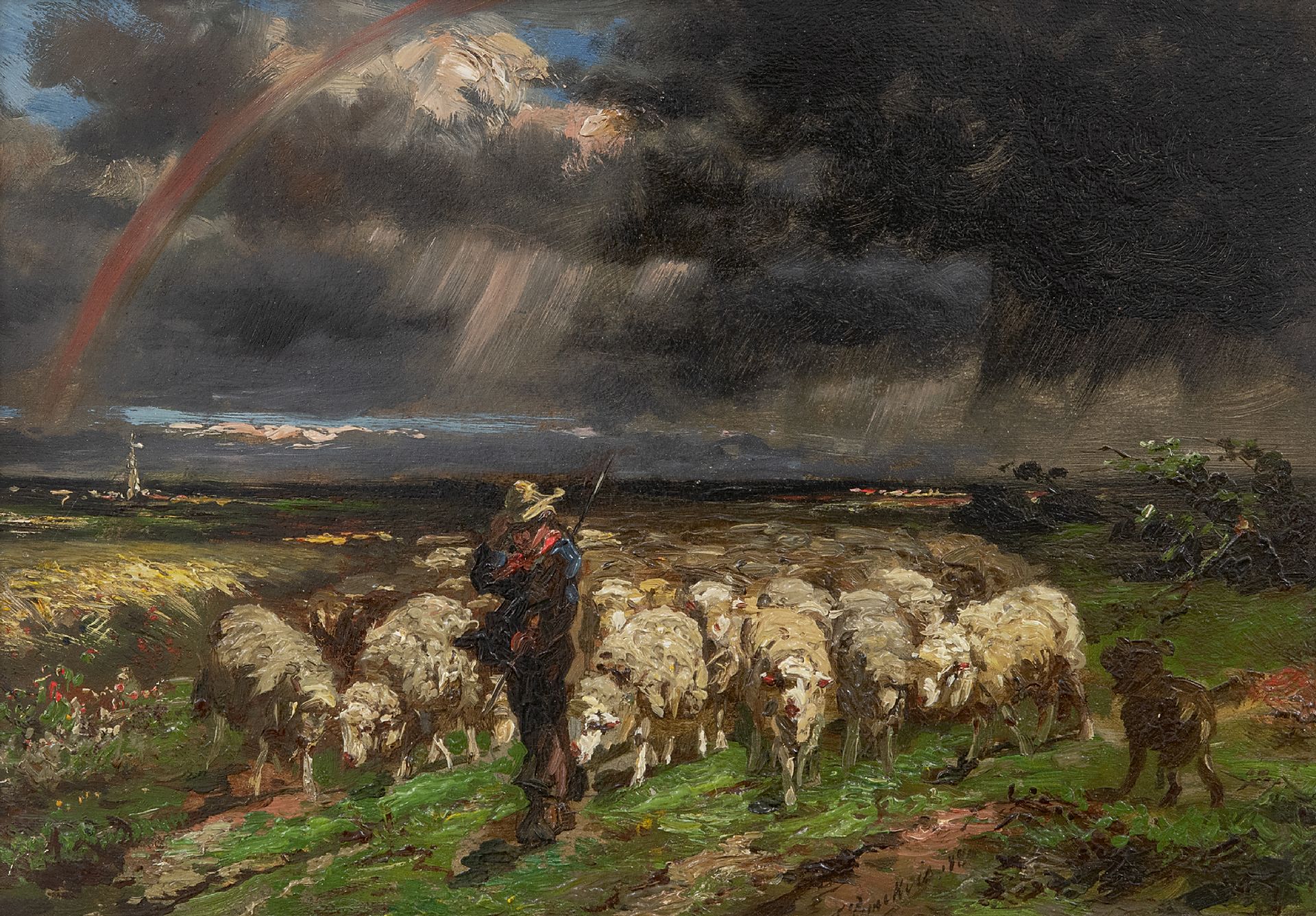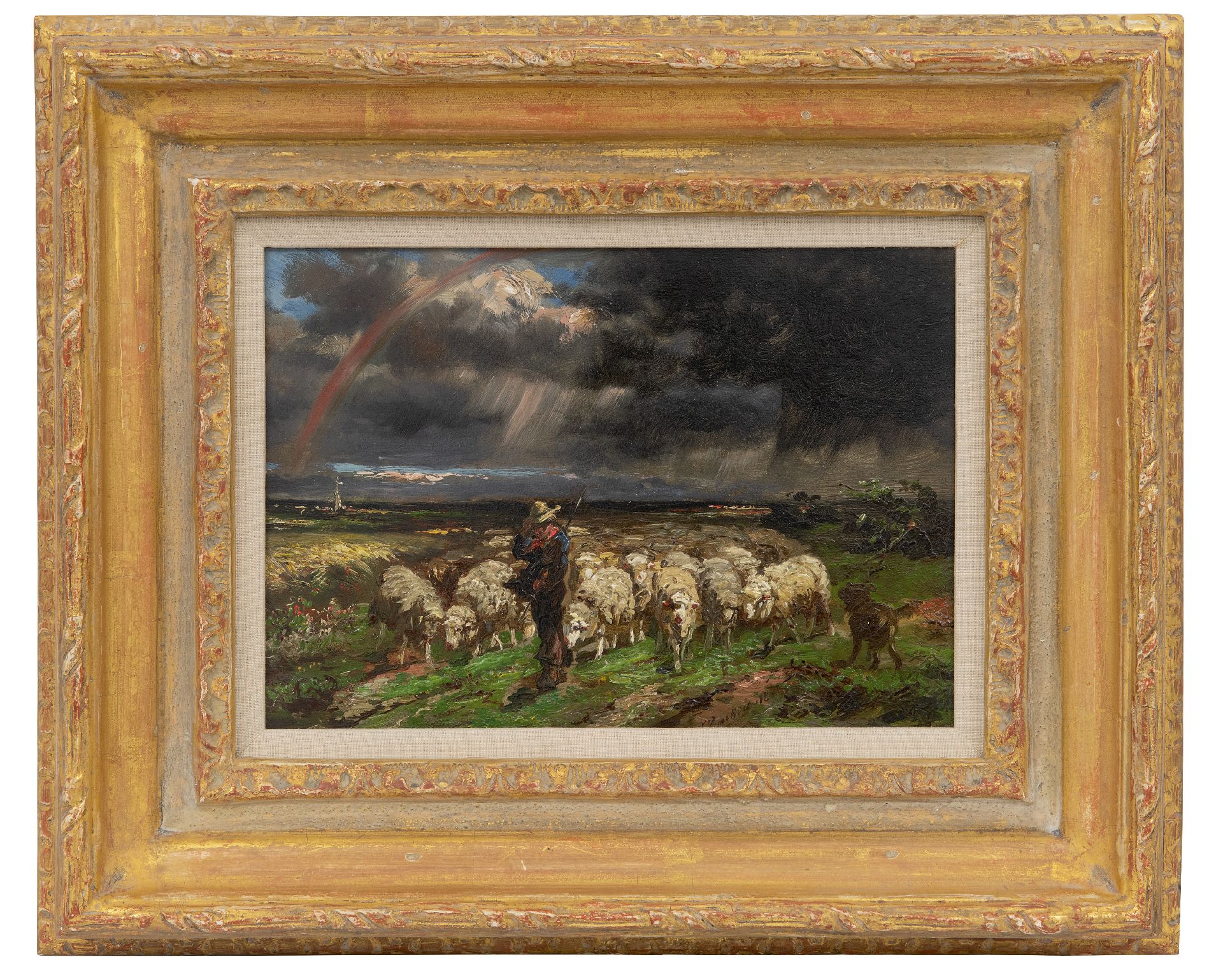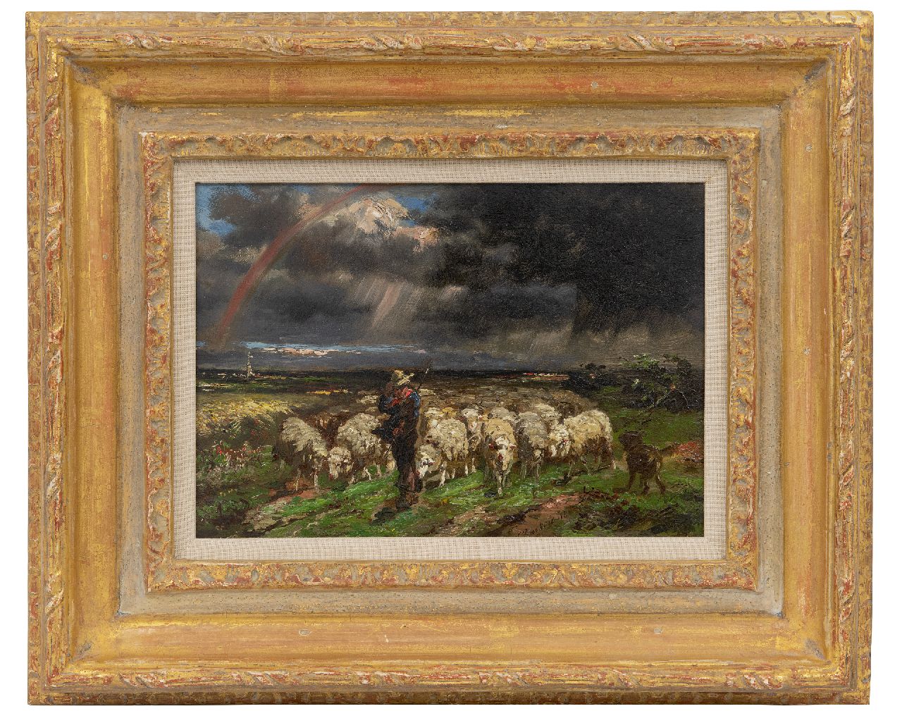 Franse School kunstwerk • schilderij • te koop Kudde schapen, vluchtend voor het onweer/regenboog