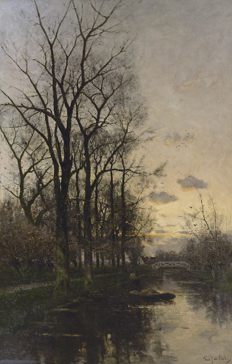 De Utrechtse Vecht en omgeving inspireerden F.J. van Rossum du Chattel tot het schilderen van talloze impressies van deze rivier. Daarom wordt hij door critici wel ‘de schilder van de Vecht' genoemd. Daarnaast schilderde hij het landschap rond Den Haag. De kunstenaar werd in 1856 in Leiden geboren en kreeg zijn eerste schilderlessen van zijn vader, Jan Hendrik van Rossum du Chattel. Daarna bezocht hij in Den Haag de 'Teekenschool' en werkte op het atelier van Willem Maris. Hoewel Van Rossum du Chattel duidelijk werd gevormd door de Haagse School ontwikkelde hij een geheel eigen, kenmerkende stijl.