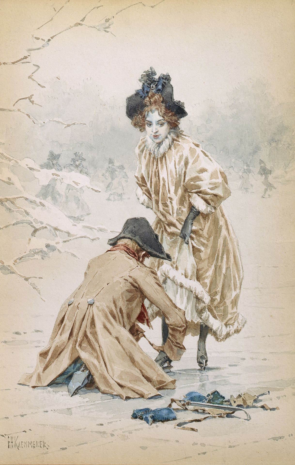 Frederik Hendrik Kaemmerer kunstwerk • aquarel • tekening • voorheen te koop Het onderbinden van de schaatsen