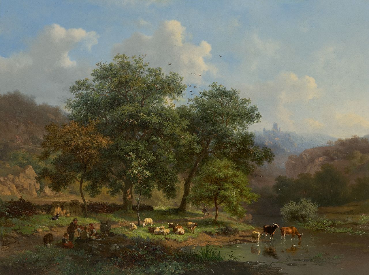 Frederik Marinus Kruseman kunstwerk • schilderij • te koop Zomerlandschap met rustend landvolk en vee bij een rivier