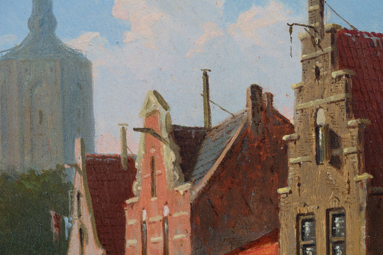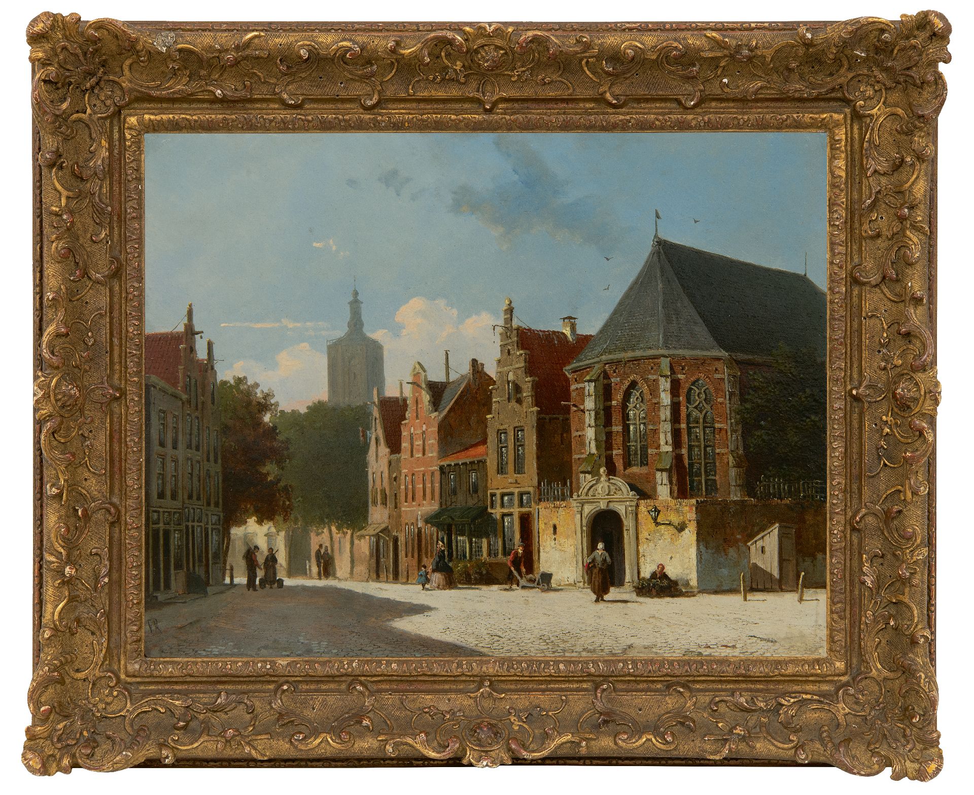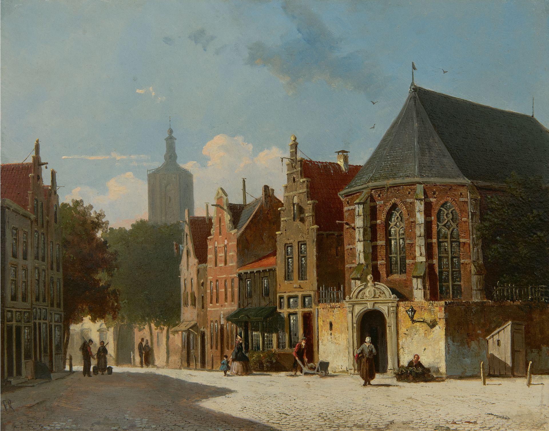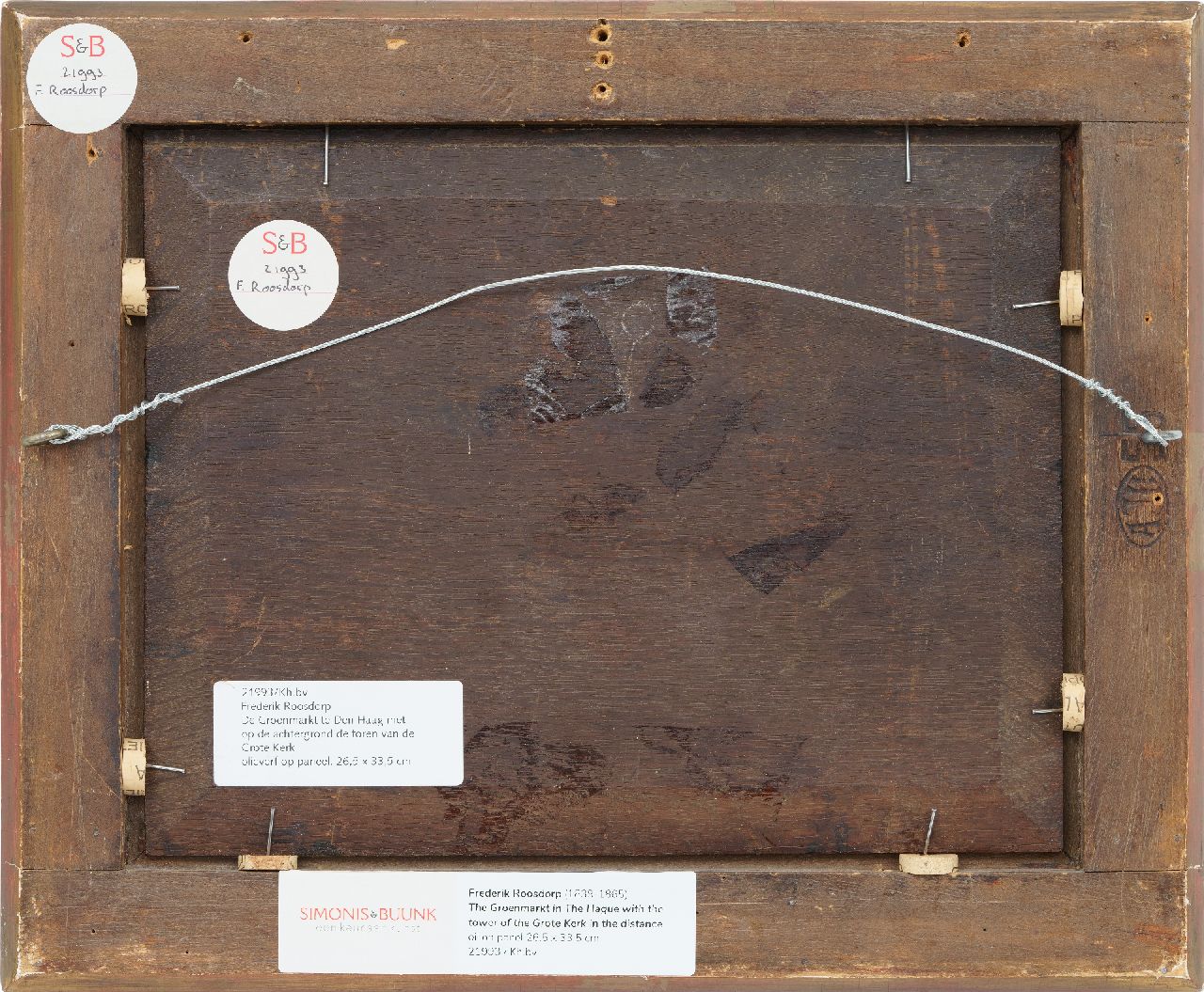 Frederik Roosdorp kunstwerk • schilderij • voorheen te koop De Groenmarkt te Den Haag met op de achtergrond de toren van de Grote Kerk