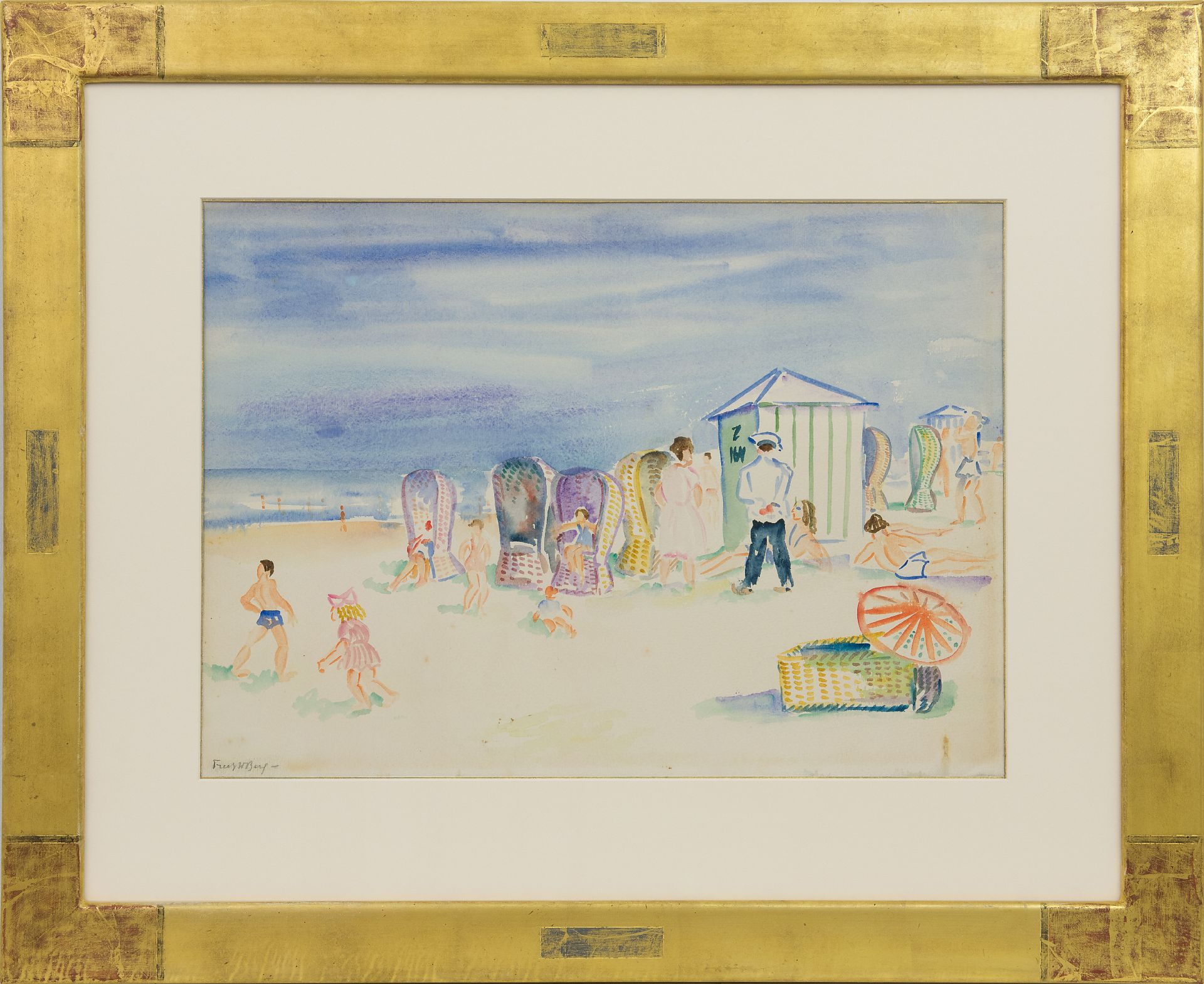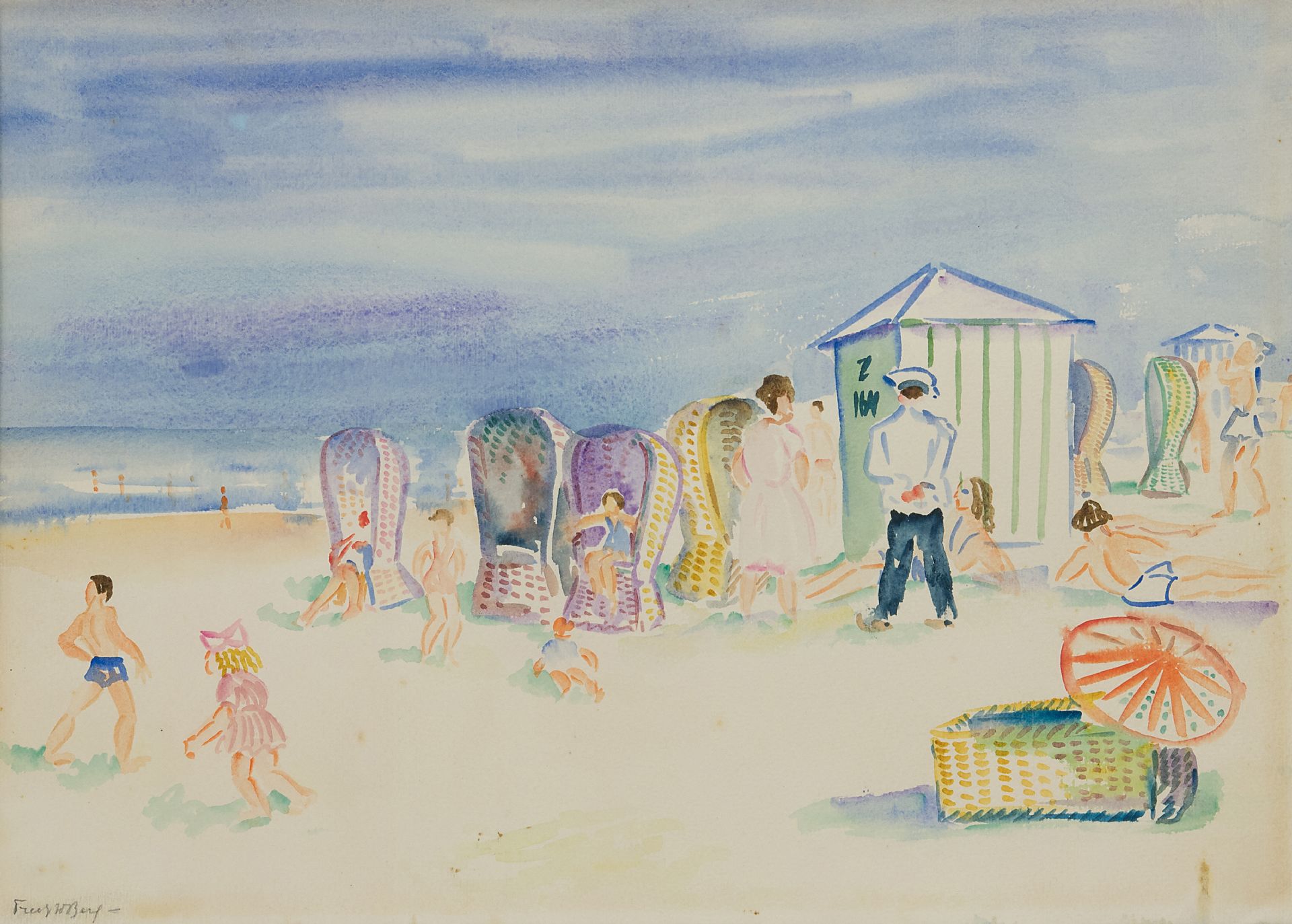 Freek van den Berg kunstwerk • aquarel • tekening • voorheen te koop Strandgezicht met figuren