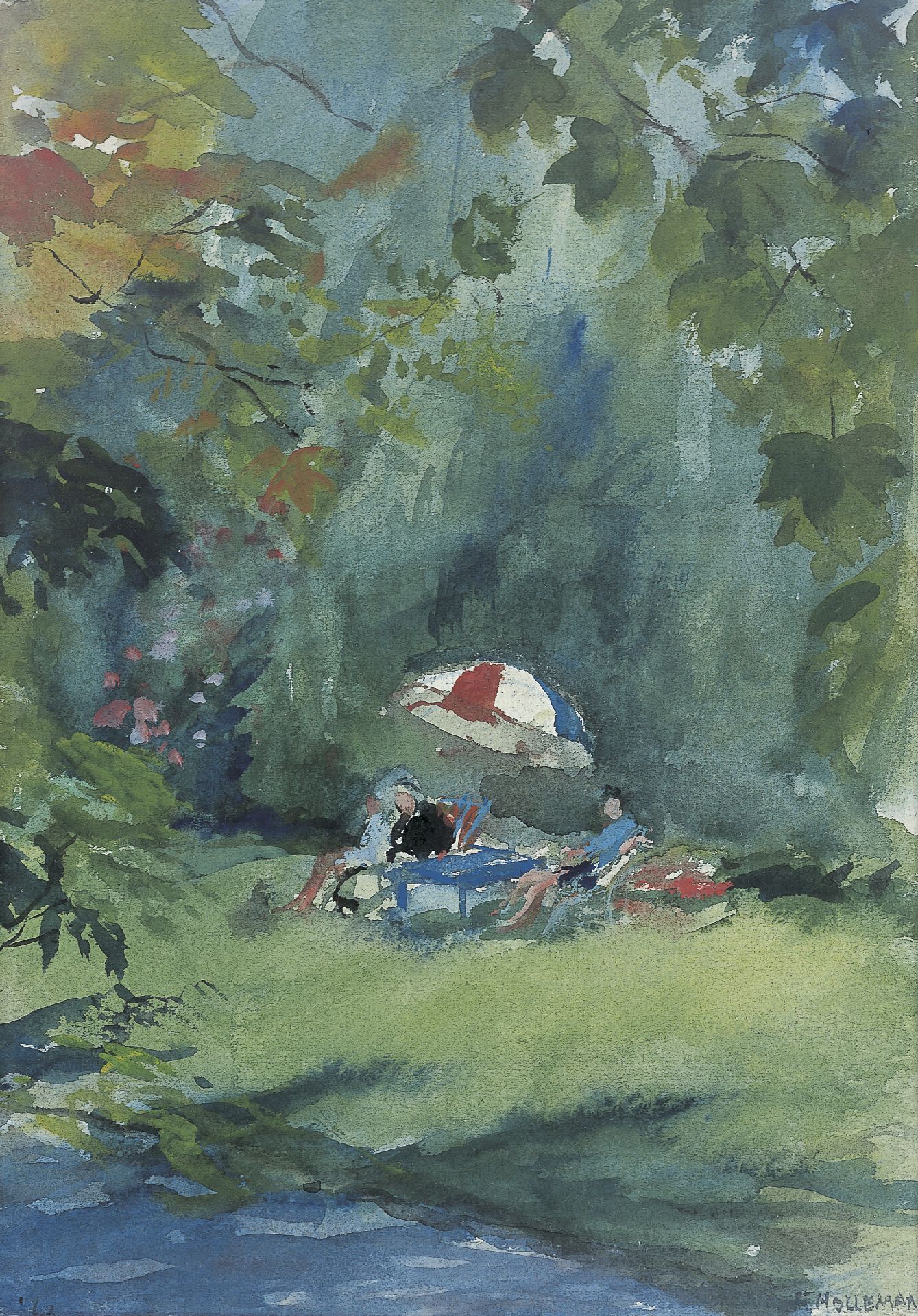 Frida Holleman kunstwerk • aquarel • tekening • voorheen te koop Picknick onder een parasol