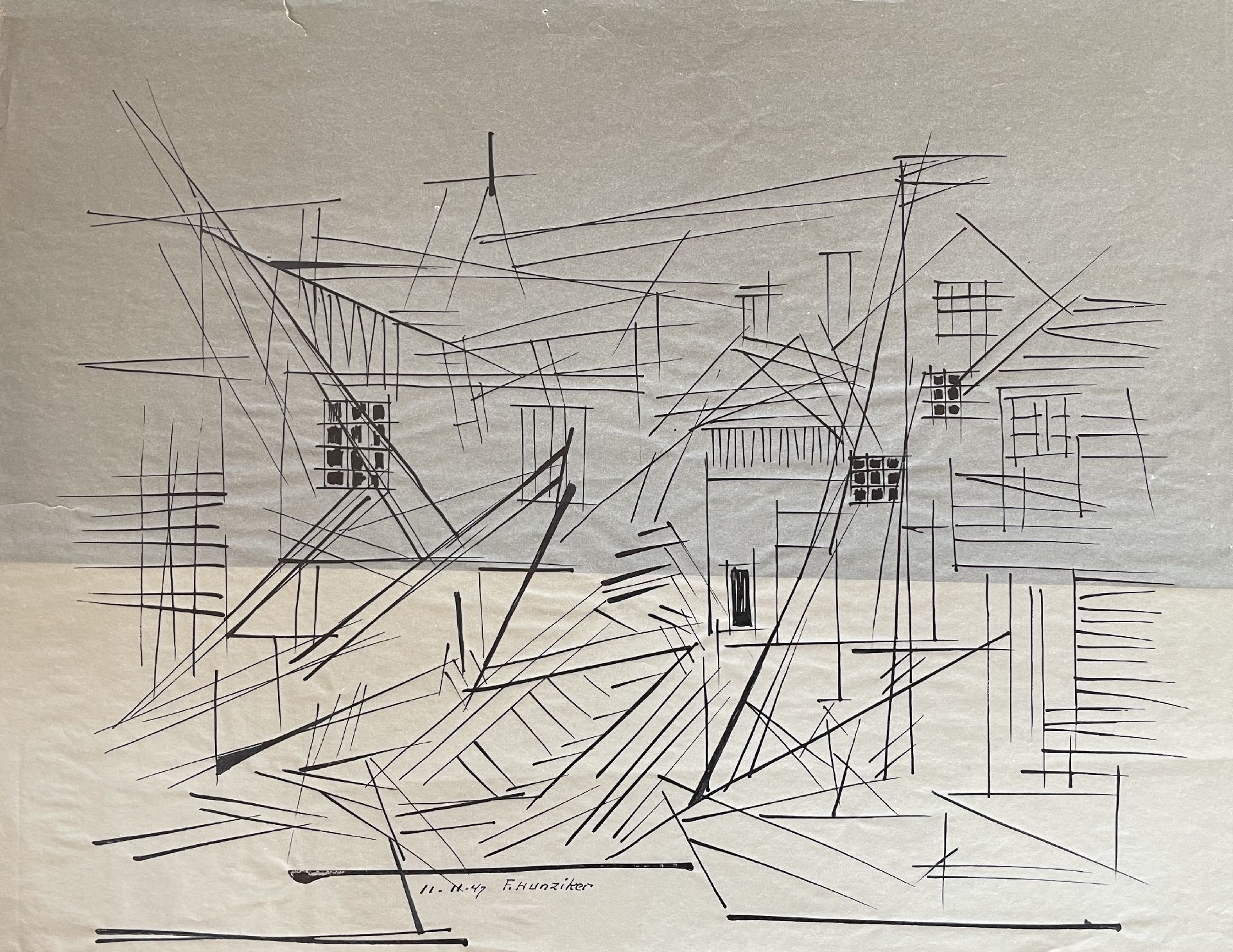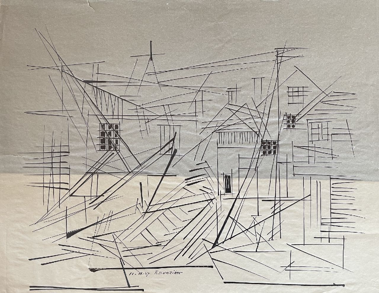 Hunziker F.  | Frieda Hunziker, Huizen en schepen, pen en inkt op vellum 30,0 x 38,5 cm, gesigneerd middenonder en gedateerd 11-11-47