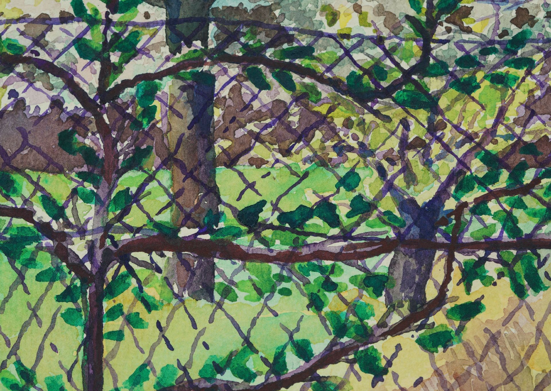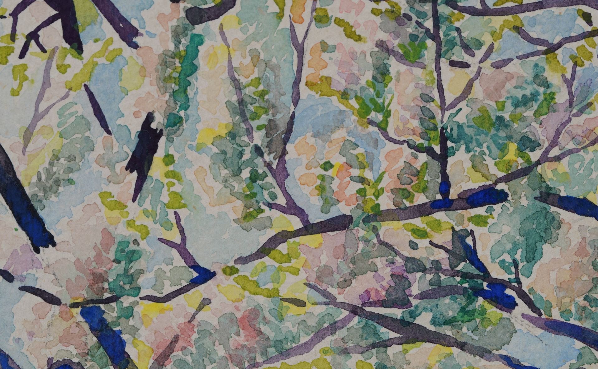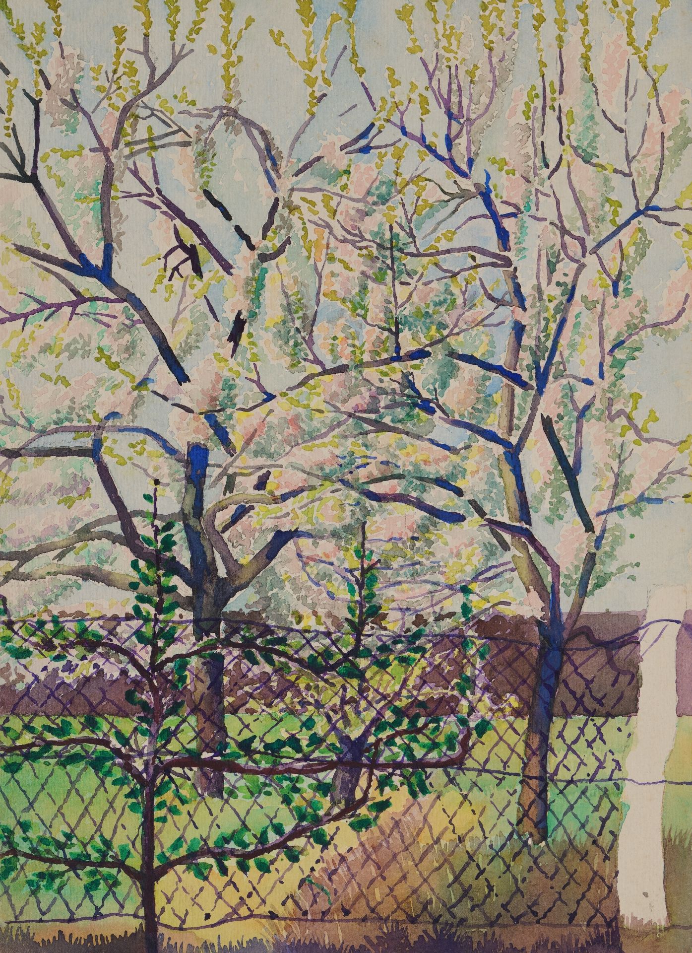 Frieda Hunziker kunstwerk • aquarel • tekening • voorheen te koop Bloesembomen in een tuin