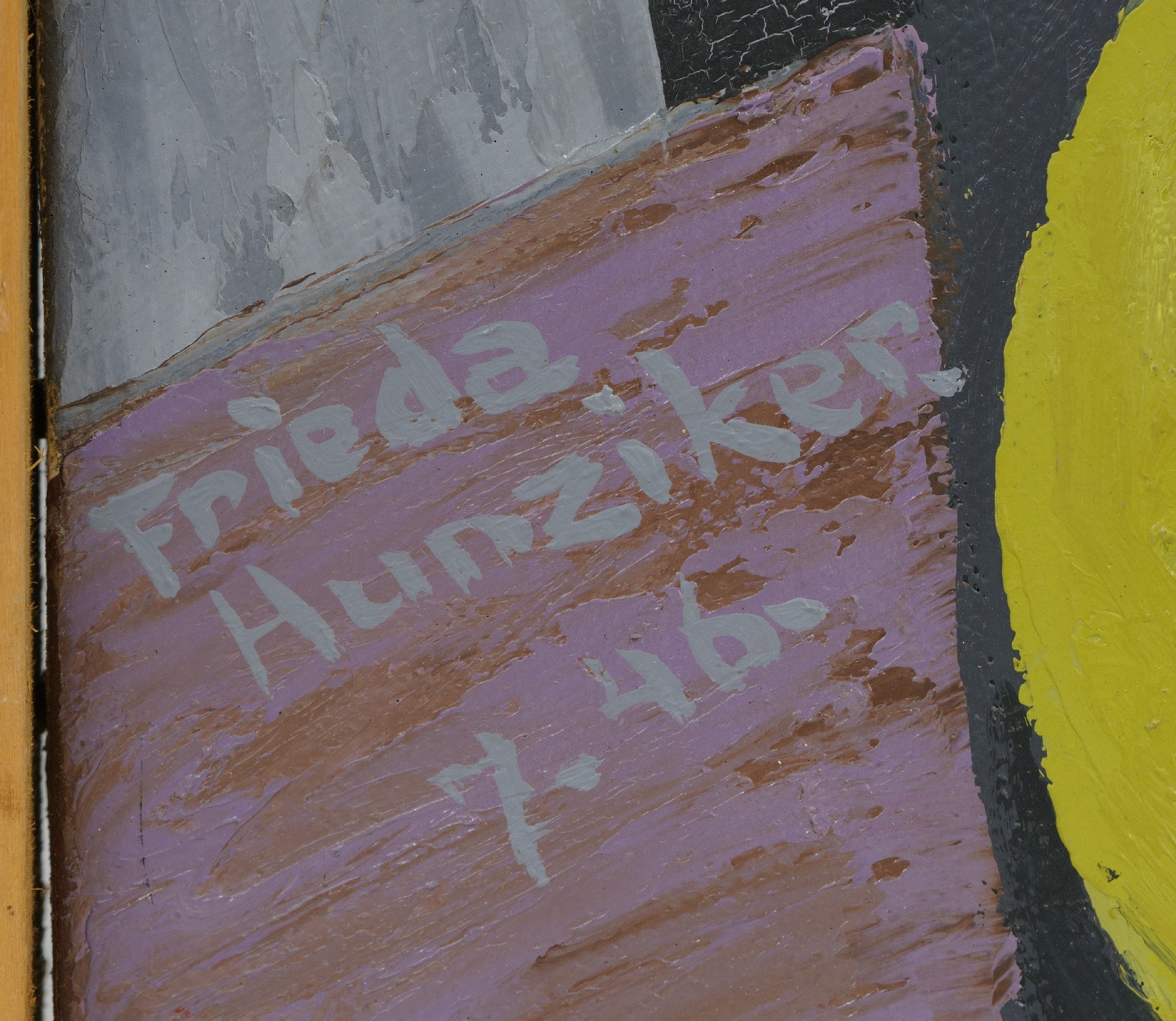 Frieda Hunziker werd in de jaren vijftig en zestig beschouwd als een opmerkelijk en vooruitstrevende kunstenares. Aanvankelijk was ze lerares tekenen totdat ze in de jaren dertig ook zelf vrij begon te werken. Haar vroege werk kenmerkt zich door een vereenvoudigde, realistische stijl. In 1948 kwam ze tot volledige abstractie. Het jaar daarvoor was ze een van de oprichters van Vrij Beelden. Deze groep kunstenaars exposeerde regelmatig in het Stedelijk Museum in Amsterdam en nam in het streven naar non figuratie een volwaardige plaats in naast de Experimentelen en Cobra. Hunziker was de enige vrouw in de groep en tevens een van de meest actieve leden.