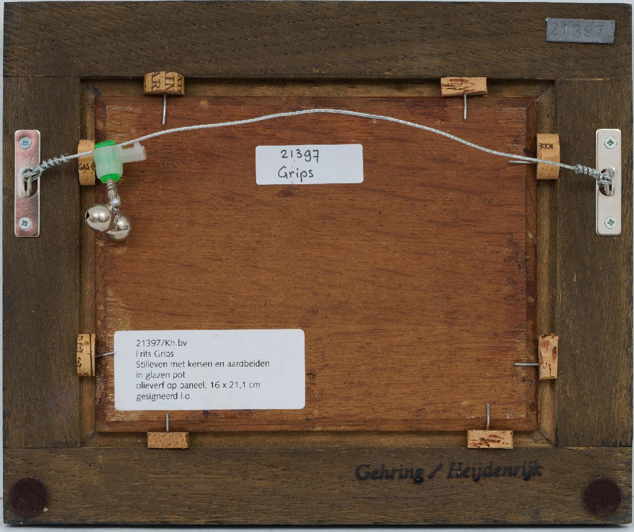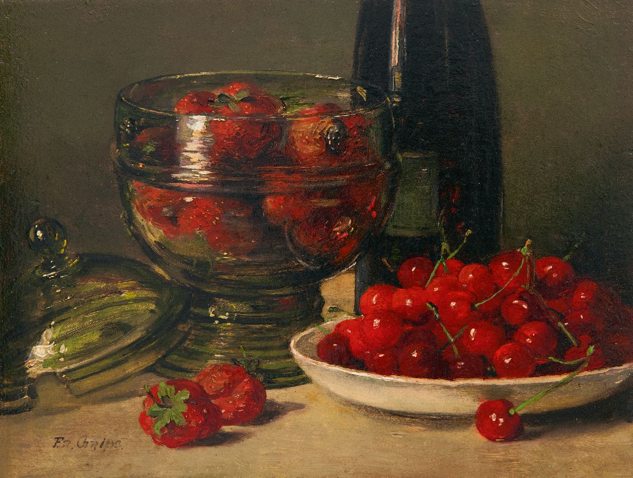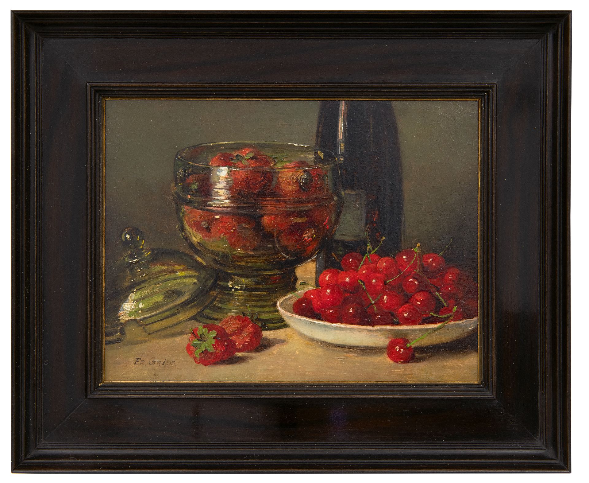 Frits Grips kunstwerk • schilderij • voorheen te koop Stilleven met kersen en aardbeien in glazen pot