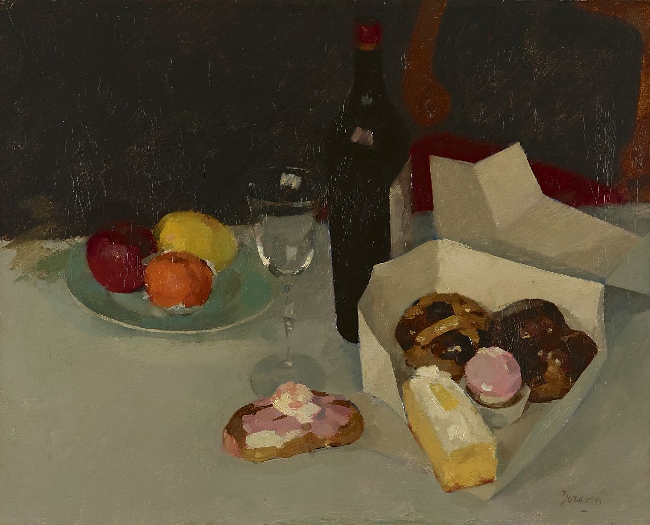 Frits Verdonk kunstwerk • schilderij • voorheen te koop Stilleven met wijnfles en gebakjes