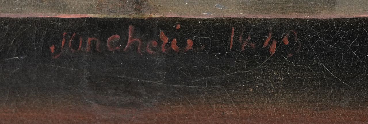 Gabriel Germain Joncherie, van wie de precieze geboorte- en sterfdatum niet bekend zijn, werkte als schilder van stillevens en interieurs in Parijs. Zijn composities zijn wonderlijk origineel. Ongewone onderwerpen en combinaties van voorwerpen kenmerken zijn werk: opgezette dieren, kunstkamerobjecten, een bankloket, gebakken eieren op een stoof. Ook zijn trompe l’oeil stillevens en interieurs met figuren, vaak bijzonder van inhoud, werden in zijn tijd al geprezen door critici. Tussen 1831 en 1844 exposeerde hij op de Parijse Salon.