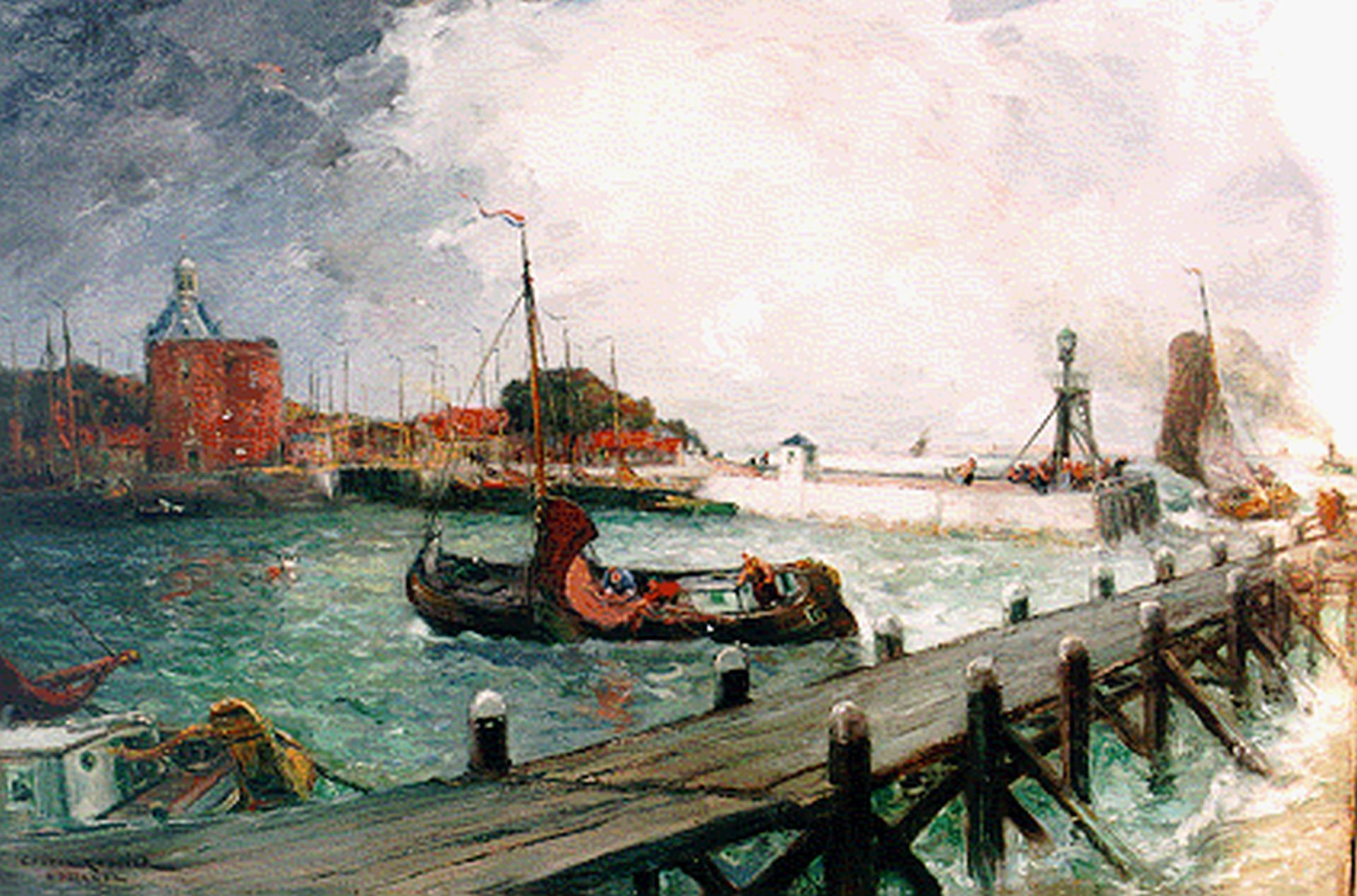 Gaston Roullet kunstwerk • schilderij • voorheen te koop De haven van Enkhuizen