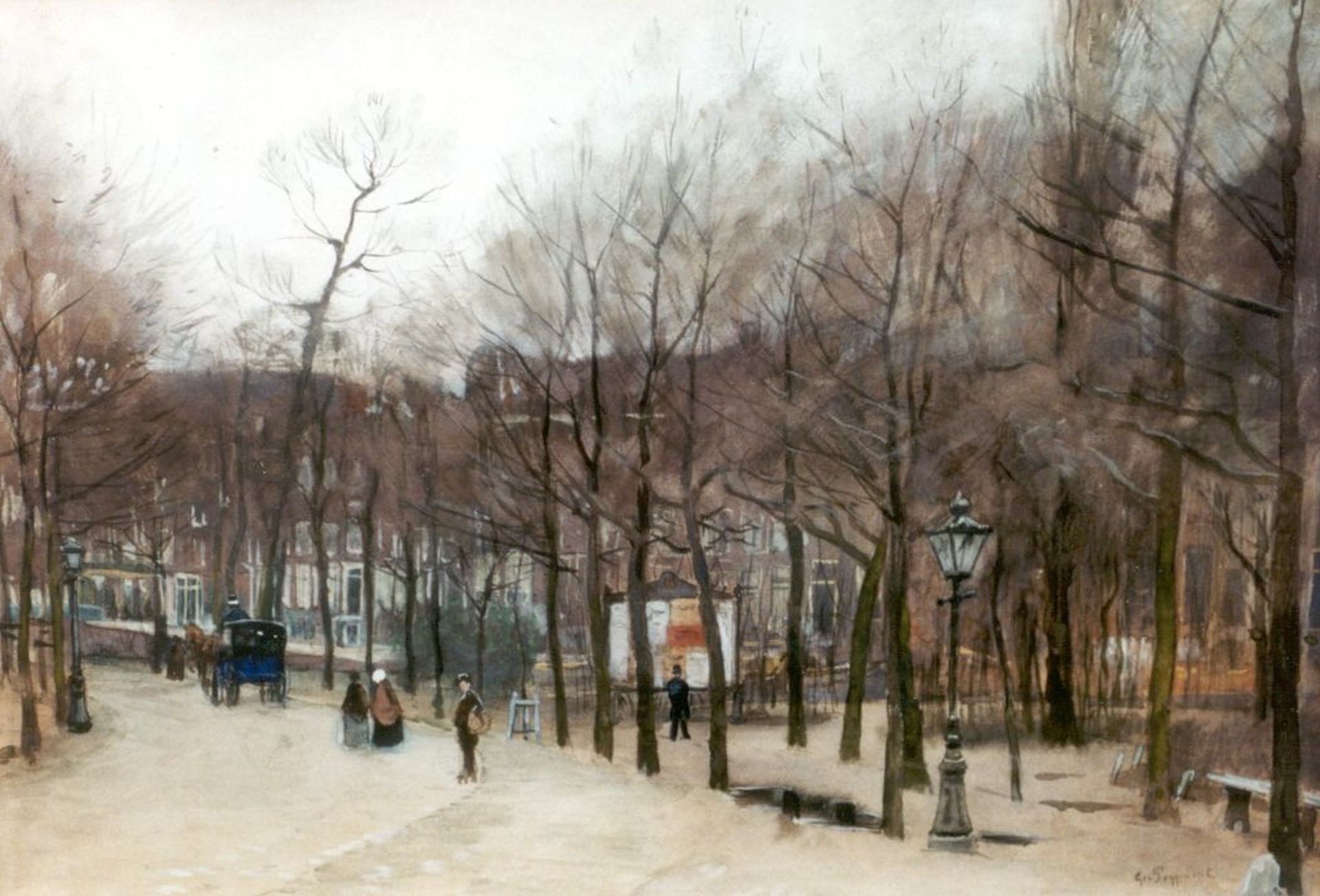 Geo Poggenbeek kunstwerk • aquarel • tekening • voorheen te koop Stadsgezicht met figuren, Amsterdam