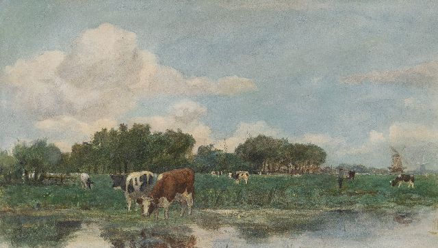 Geo Poggenbeek | Hollands weidelandschap met koeien en molens, aquarel op papier, 23,5 x 41,0 cm, gesigneerd l.o.