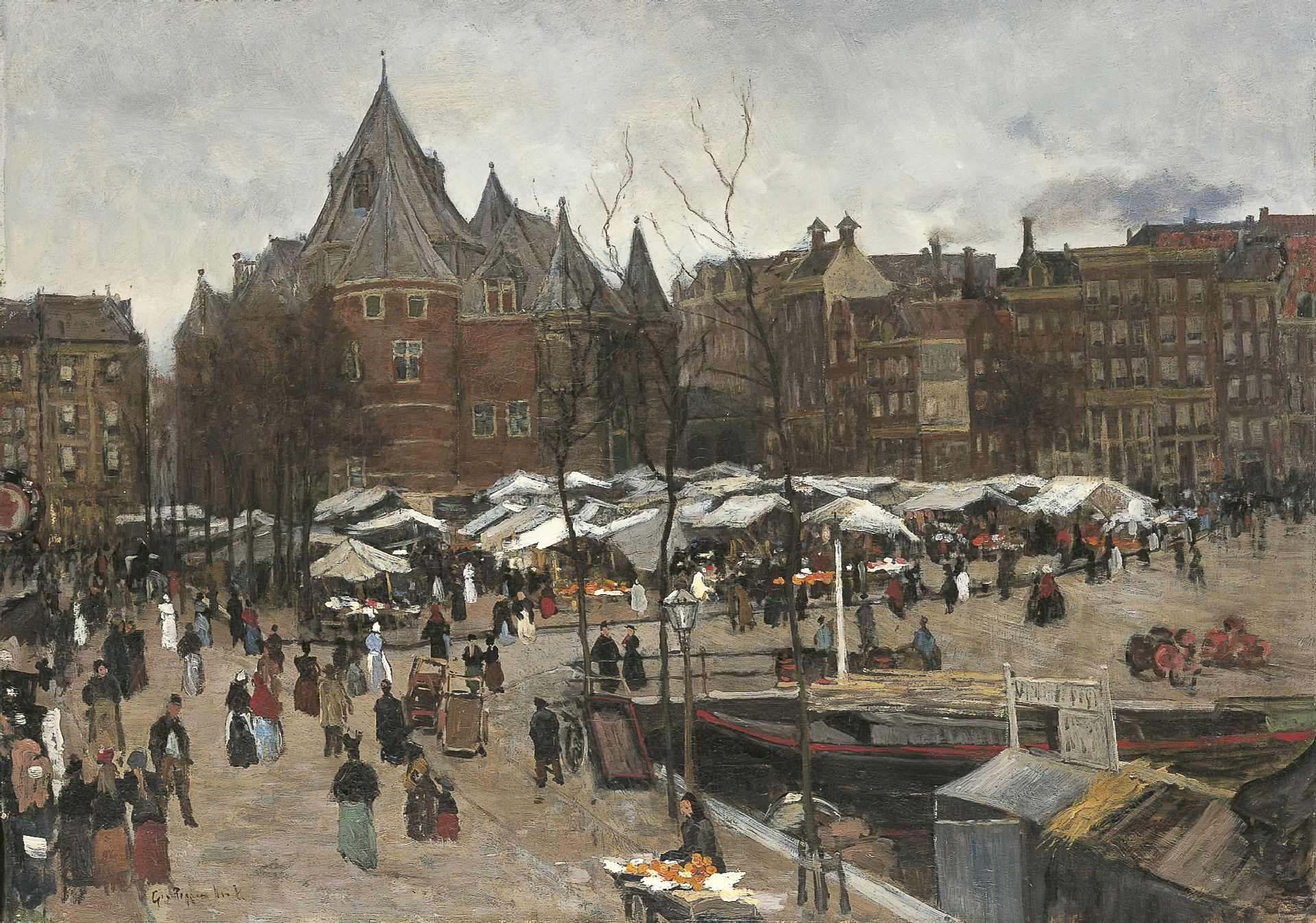 Geo Poggenbeek kunstwerk • schilderij • voorheen te koop Marktdag op de Nieuwmarkt, Amsterdam