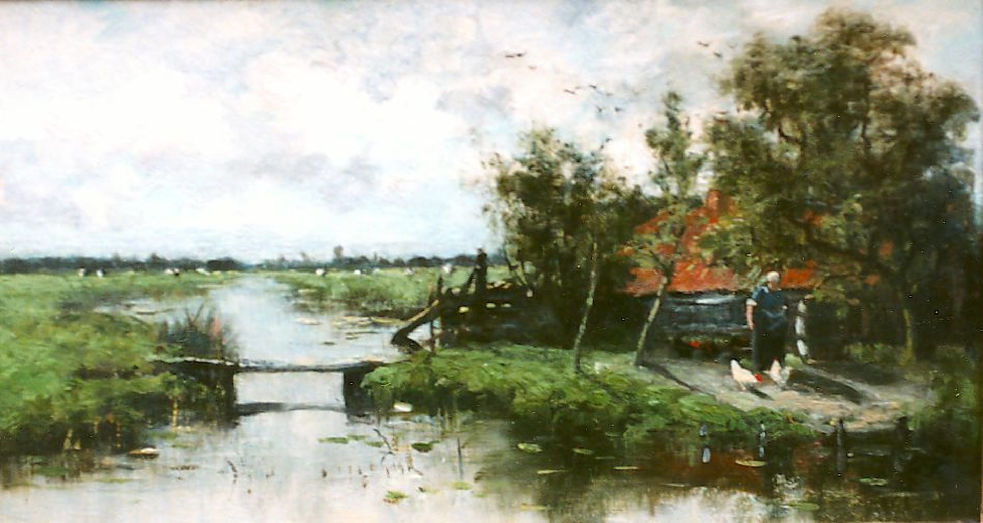 Geo Poggenbeek kunstwerk • schilderij • voorheen te koop Rivierlandschap met boerin die kippen voert