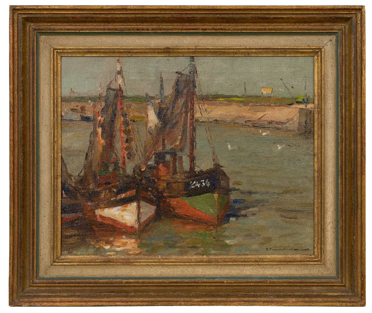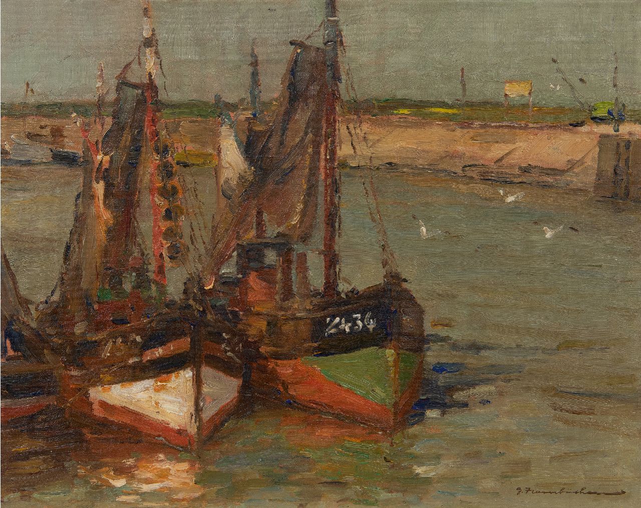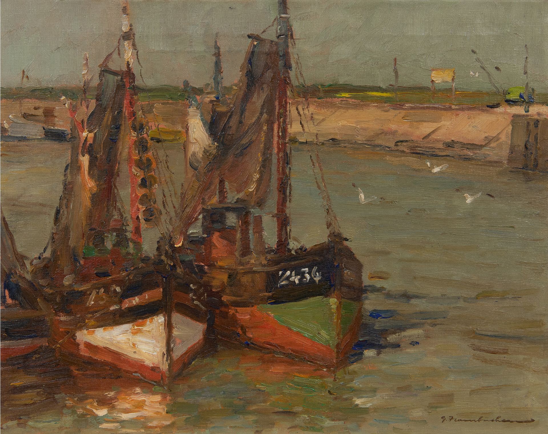 Georg Hambüchen kunstwerk • schilderij • te koop Vissersboten in de haven van Zeebrugge