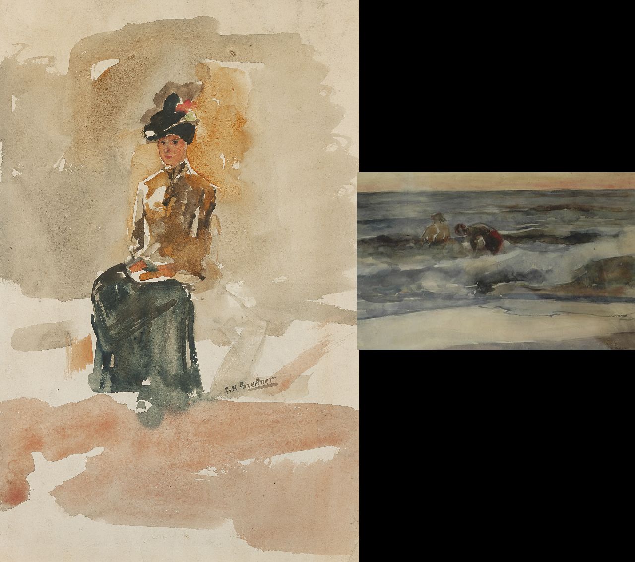 George Hendrik Breitner kunstwerk • aquarel • tekening • voorheen te koop Een elegante vrouw, zittend; verso: Badende jongens in de branding