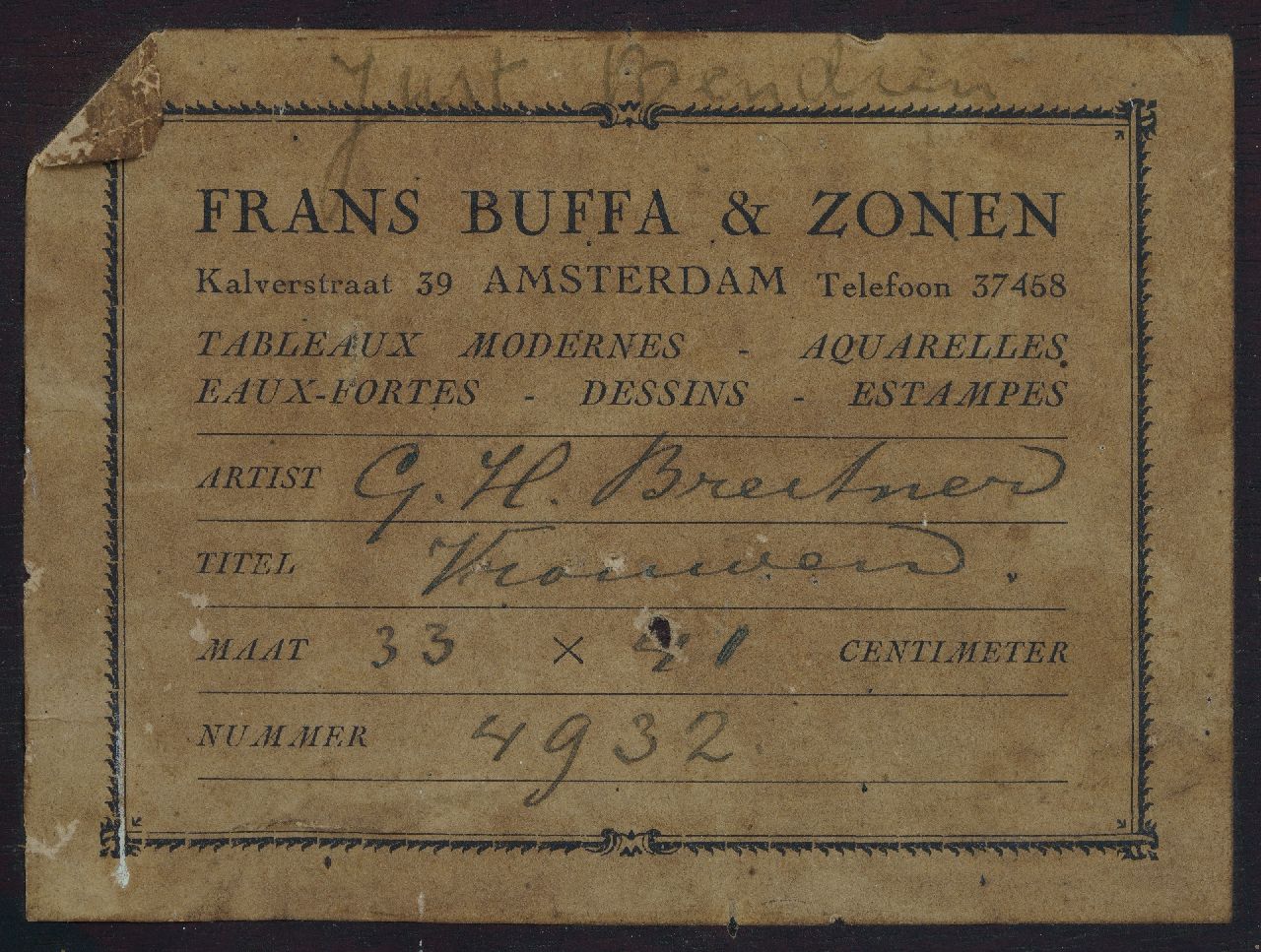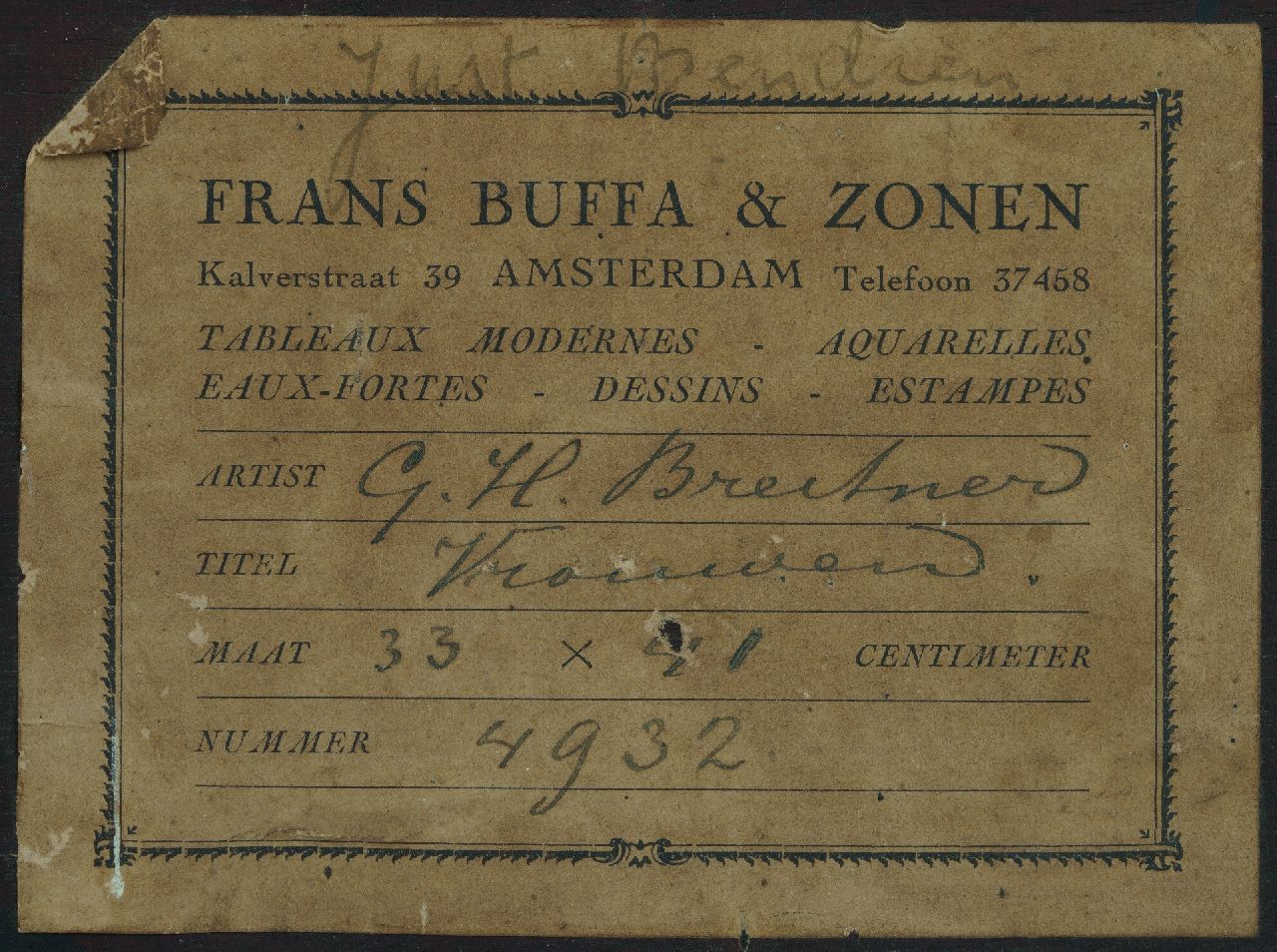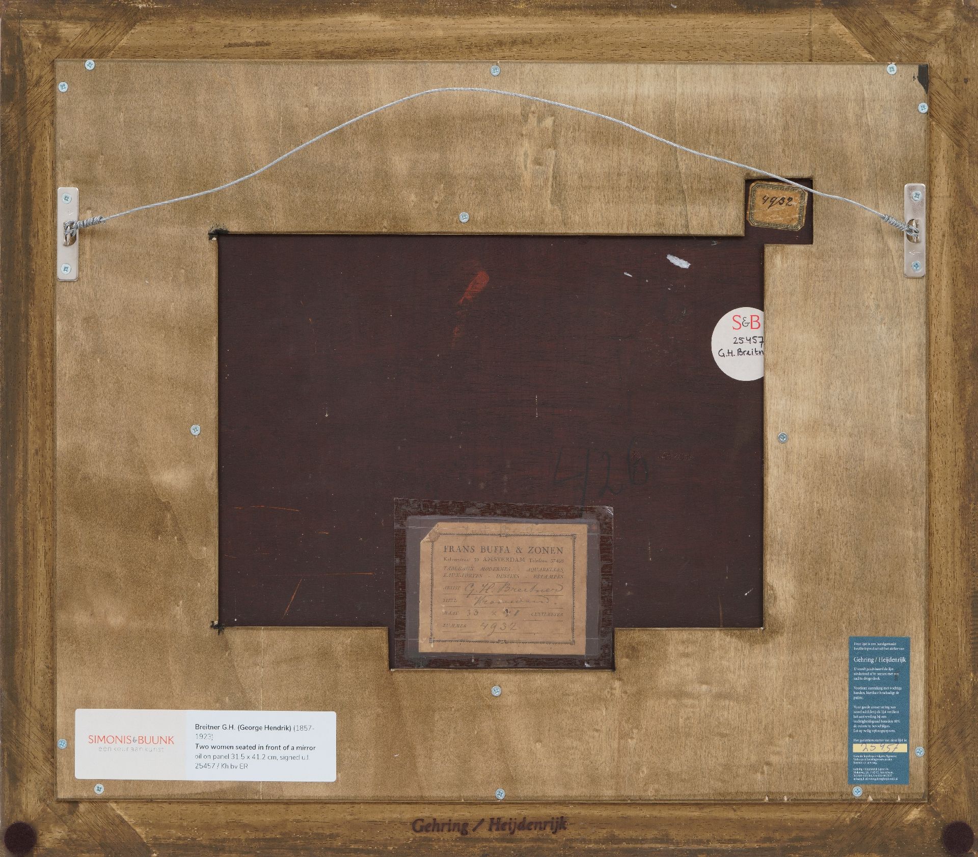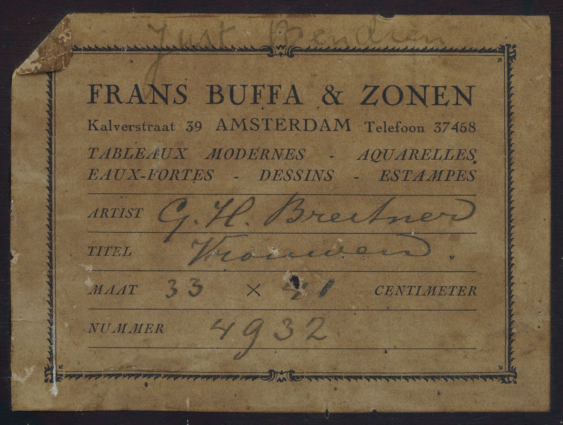 Herkomst: kunsthandel Frans Buffa & Zonen, Amsterdam, inv.nr 4932; part.coll. Amsterdam, door vererving in bezit gekomen van de vorige eigenaar.