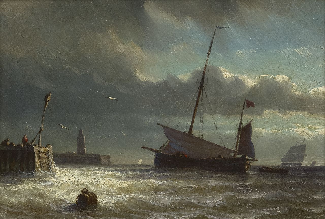 George Johannes Hoffmann | Vissersschip voor een haveningang, olieverf op paneel, 12,9 x 18,6 cm