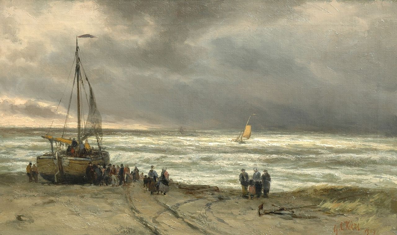 George Lourens Kiers kunstwerk • schilderij • voorheen te koop Vissersvolk bij afgemeerde bomschuit