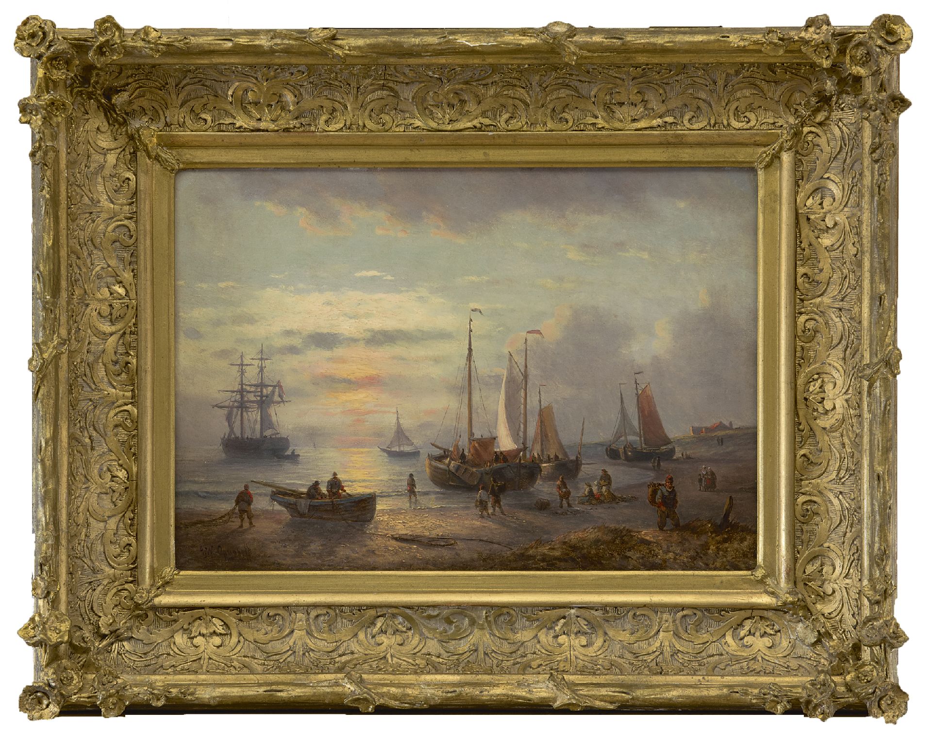 George Willem Opdenhoff kunstwerk • schilderij • voorheen te koop Vissers en pinken op het strand bij ondergaande zon