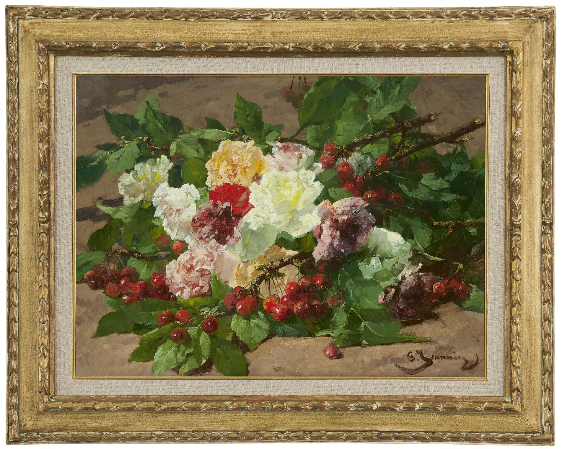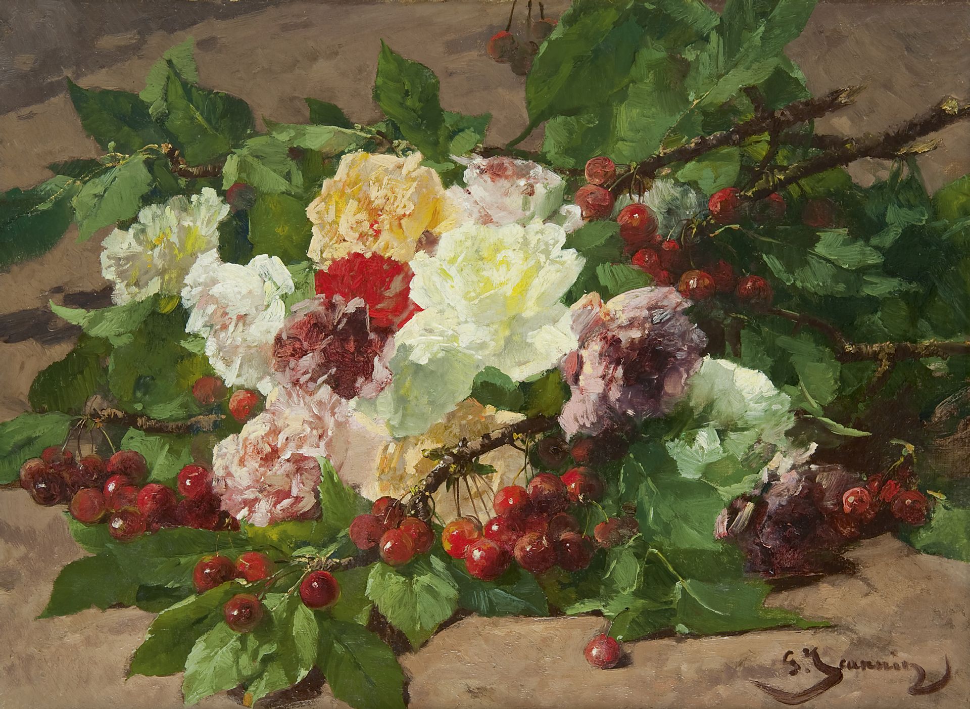 Georges Jeannin kunstwerk • schilderij • voorheen te koop Kersentakken en rozen op de bosgrond