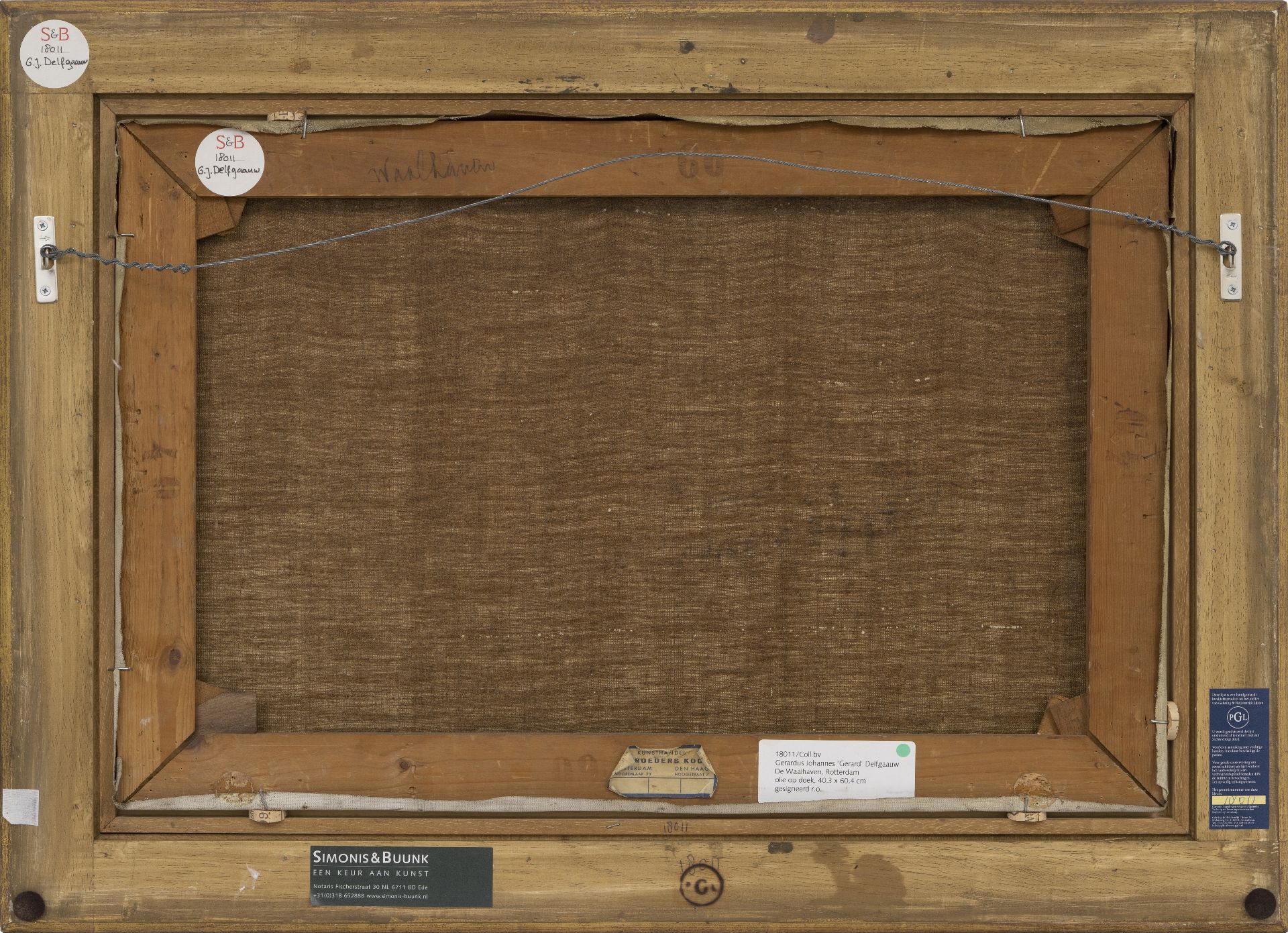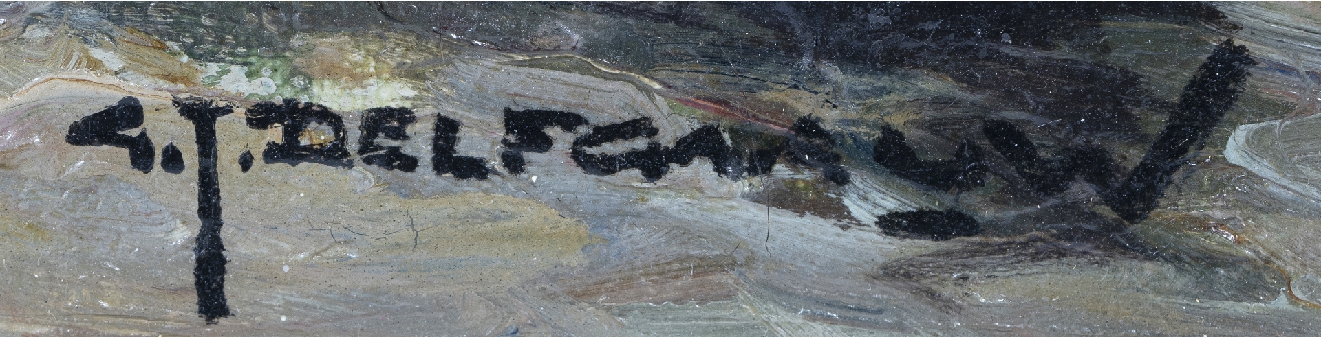 Gerard Delfgaauw groeide op in het waterrijke Westland. Het is dan ook niet vreemd dat het polderlandschap van zijn geboortestreek een belangrijk onderwerp binnen zijn oeuvre is. Hij schilderde veel dorps- en stadsgezichten bij zomer en winter, die in zijn tijd grote aftrek vonden. Daarnaast kreeg hij bekendheid met zijn dynamische voorstellingen van de bedrijvigheid in de Rotterdamse havens. Delfgaauw werkte in een impressionistisch-naturalistische stijl. Vooral de wijze waarop hij het zonlicht en haar reflecties in het water op het doek heeft weten te 'vangen' wordt erg gewaardeerd. Hij vormde zich voornamelijk zelf nadat aanvankelijk een opleiding aan de toenmalige tekenacademie in Den Haag had gevolgd.