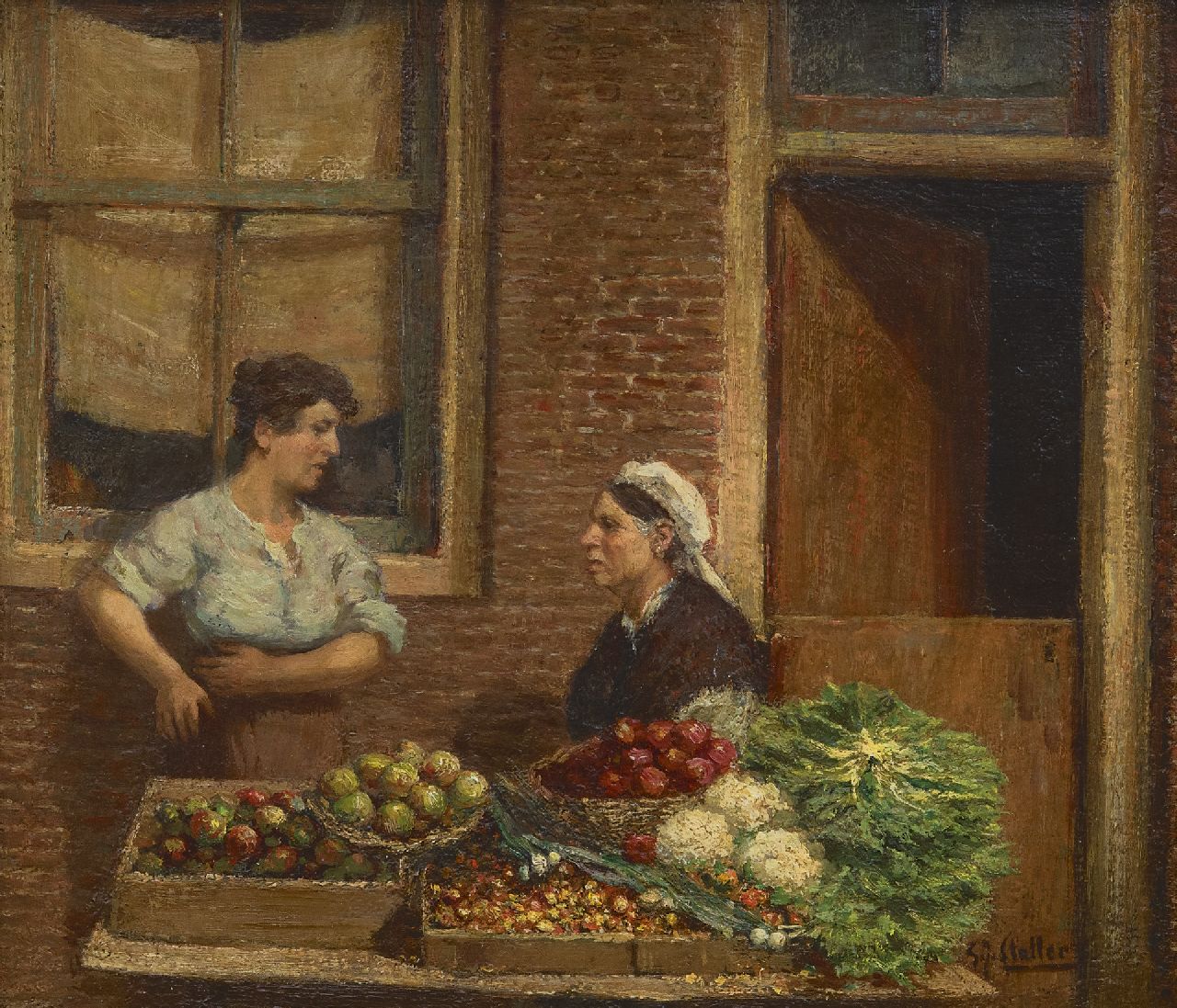 Gerard Johan Staller kunstwerk • schilderij • voorheen te koop Groenteverkoopsters, Amsterdam