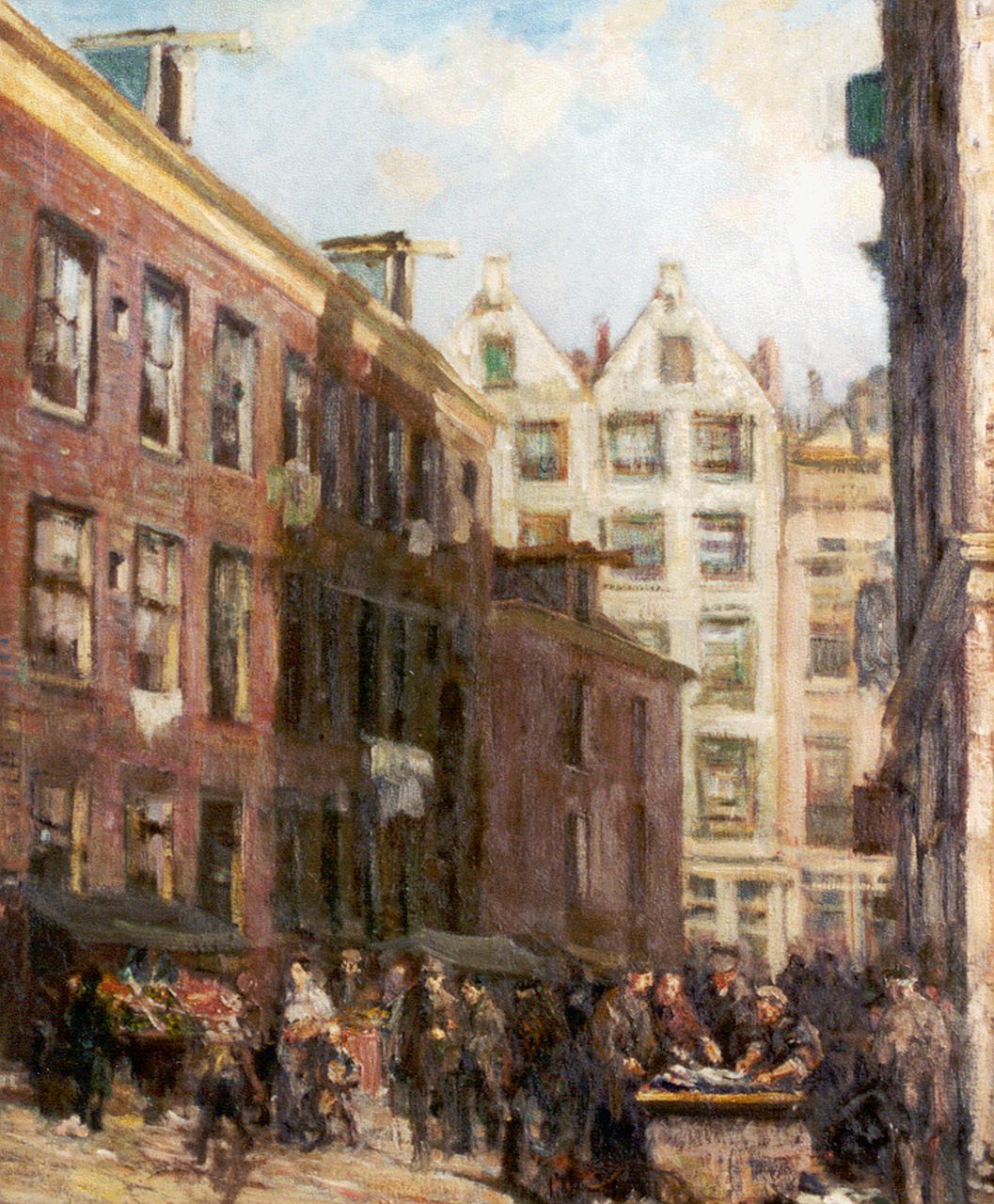 Gerard Johan Staller kunstwerk • schilderij • voorheen te koop Stadsgezicht met marktstalletjes in Amsterdam