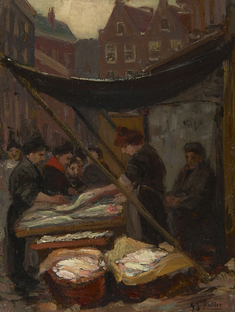 Gerard Johan Staller kunstwerk • schilderij • voorheen te koop Visverkoopster op Uilenburg, Amsterdam