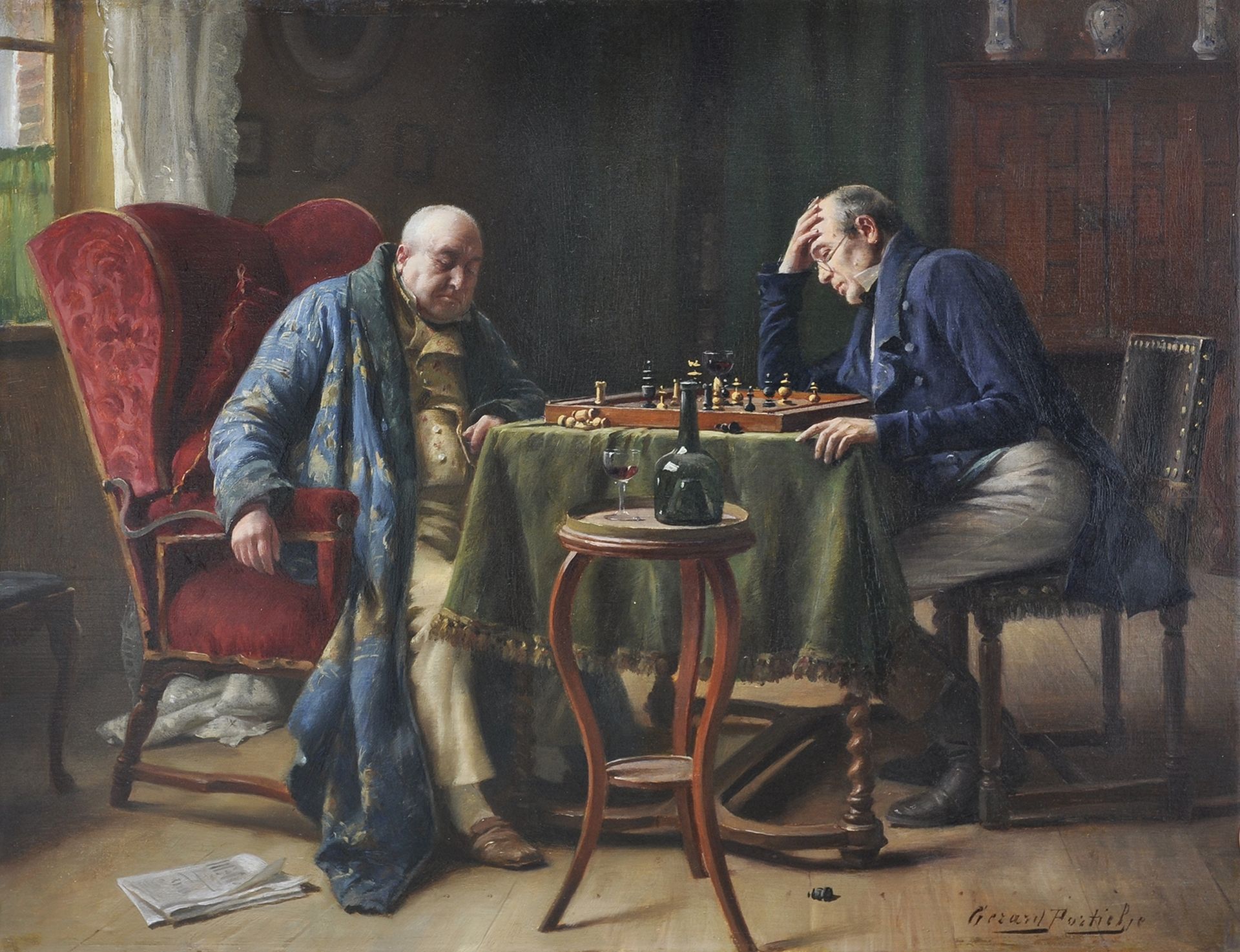 Gerard Portielje stamde uit een artistieke familie: hij was de zoon van de Belgische figuurschilder Jan Portielje, zijn jongere broer was Edward Portielje. Gerard was al in zijn tijd bijzonder geliefd om zijn vrolijke genretaferelen. Meestal spelen deze zich af op het platteland, zoals in een herberg, werkplaats, bij de notaris of in de salon van een rijke landeigenaar. Er wordt gediscussieerd, geschaakt, gekaart of uitgerust na de jacht en vaak is er sprake van een humoristische ondertoon die direct in het oog springt. De schilder had ook een zeer goed oog voor detail: porselein, zijde en kostbare stoffen en kleden schildert hij minutieus en met grote kennis van zaken.