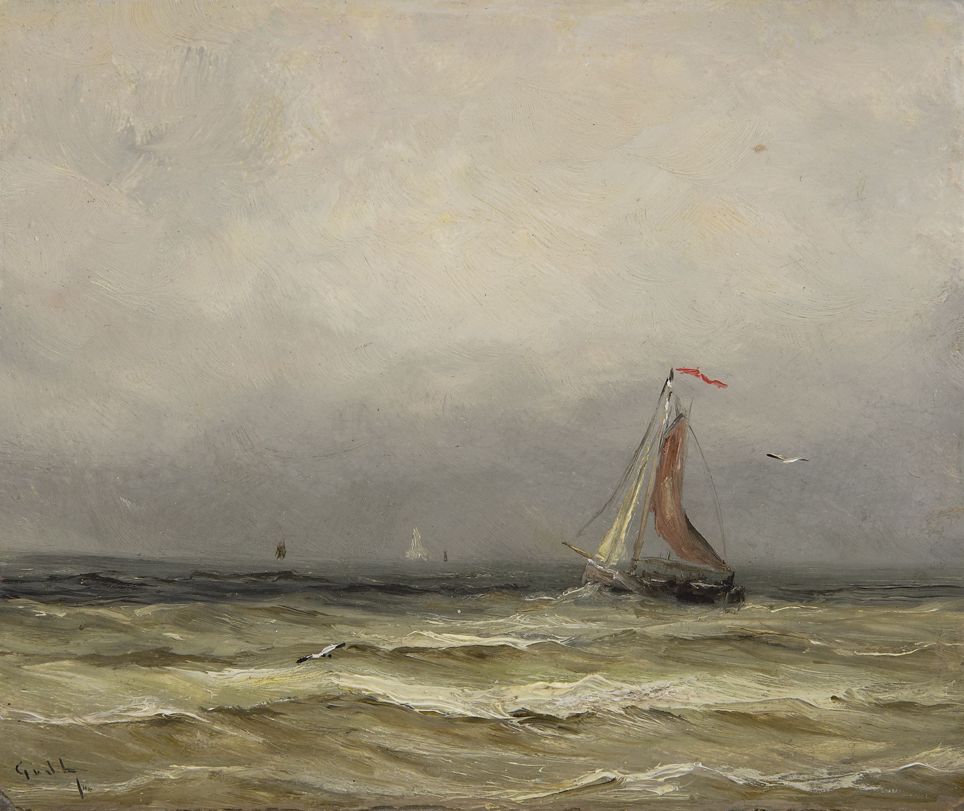 Gerard van der Laan kunstwerk • schilderij • voorheen te koop Scheveningse bomschuit op zee
