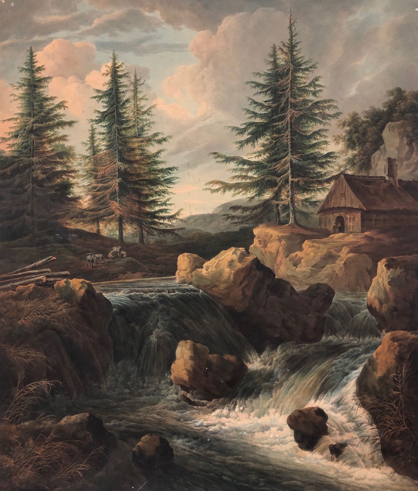 Gerard van Nijmegen kunstwerk • aquarel • tekening • te koop Berglandschap met waterval bij een hut