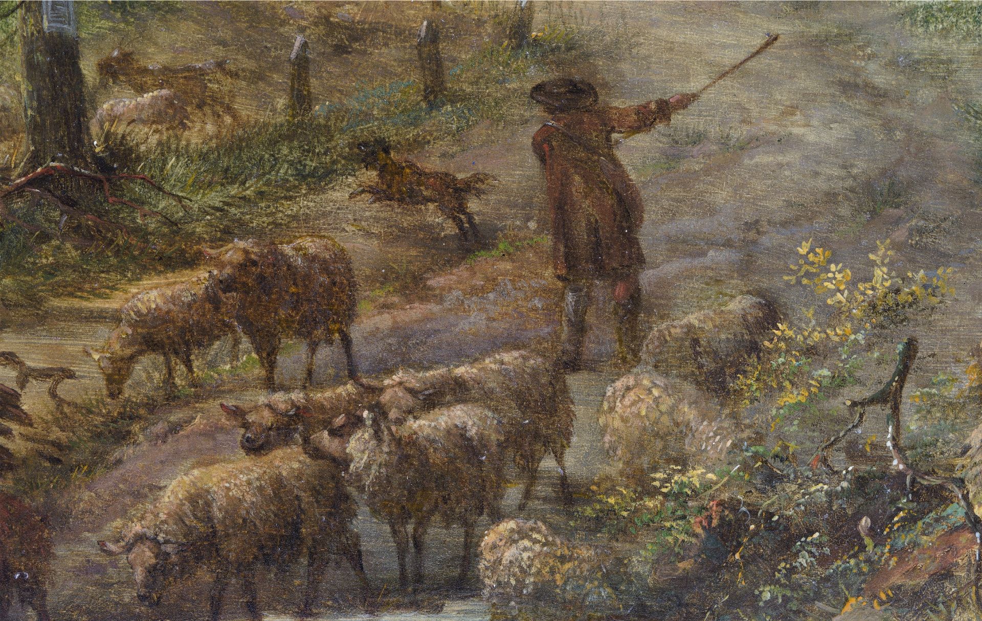 Herder met schapen bij een beek