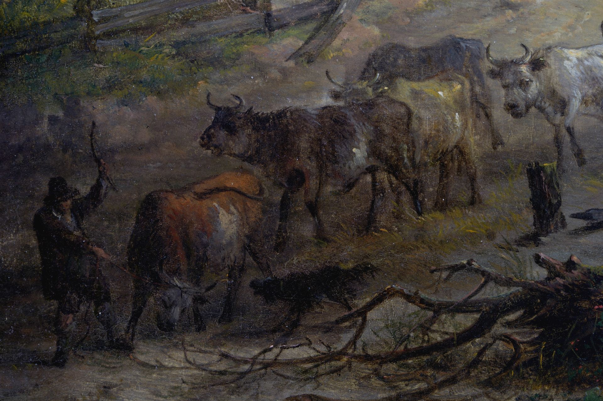 Koeherders met vee bij een rivierbedding