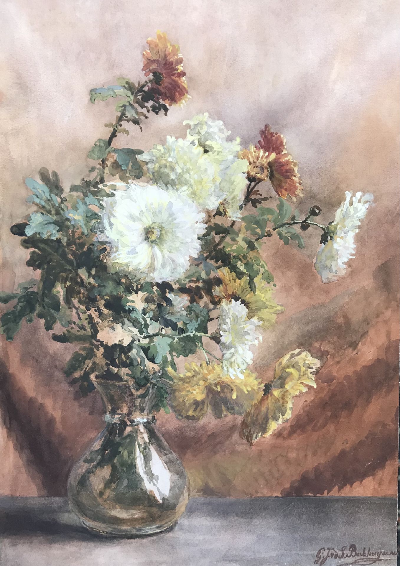 Gerardine van de Sande Bakhuyzen kunstwerk • aquarel • tekening • voorheen te koop Chrysanten in glazen vaas