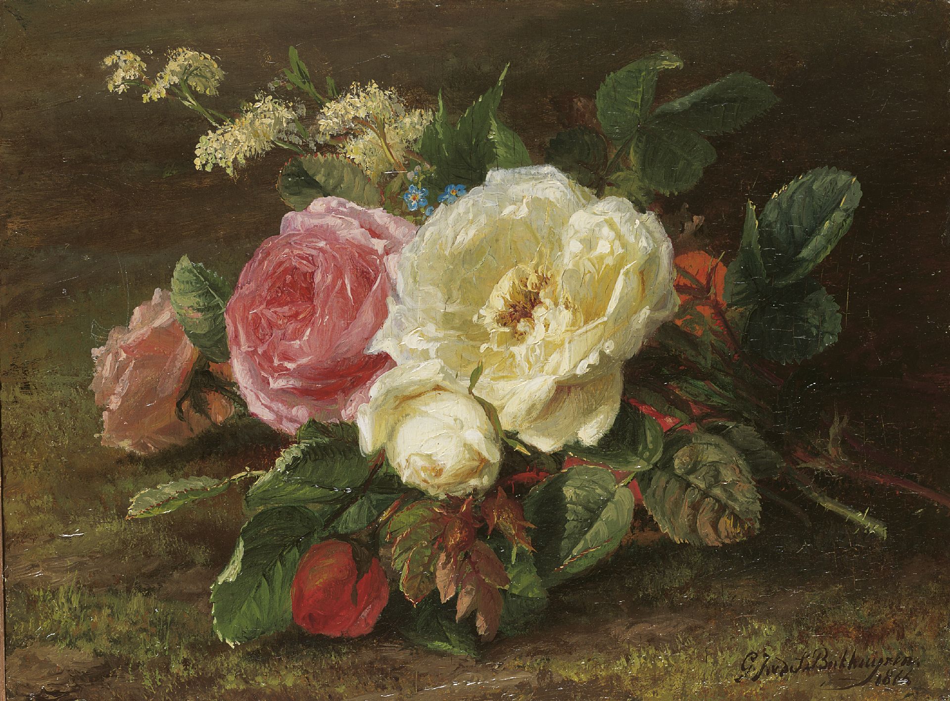 Gerardine van de Sande Bakhuyzen kunstwerk • schilderij • voorheen te koop Boeket met rozen op de bosgrond