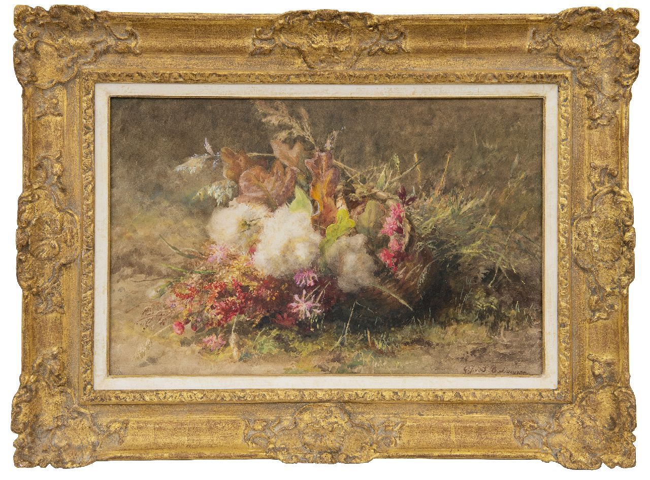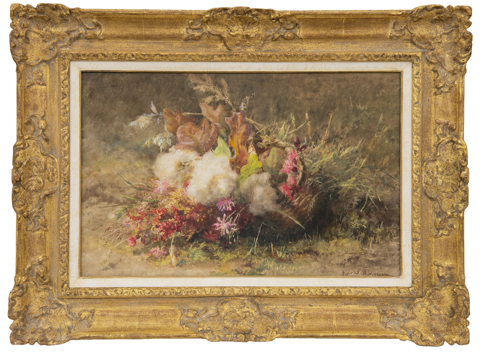 Gerardine van de Sande Bakhuyzen kunstwerk • aquarel • tekening • te koop Herfstboeket in mandje op de bosgrond