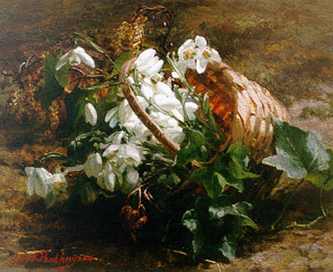 Gerardine van de Sande Bakhuyzen kunstwerk • schilderij • voorheen te koop Omgevallen mandje met sneeuwklokjes