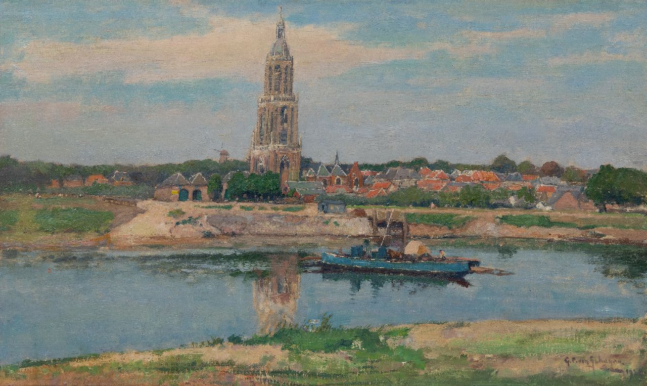 Gerbrand Frederik van Schagen kunstwerk • schilderij • voorheen te koop Gezicht op Rhenen met de Cunerakerk, het Rhenense veer op de voorgrond