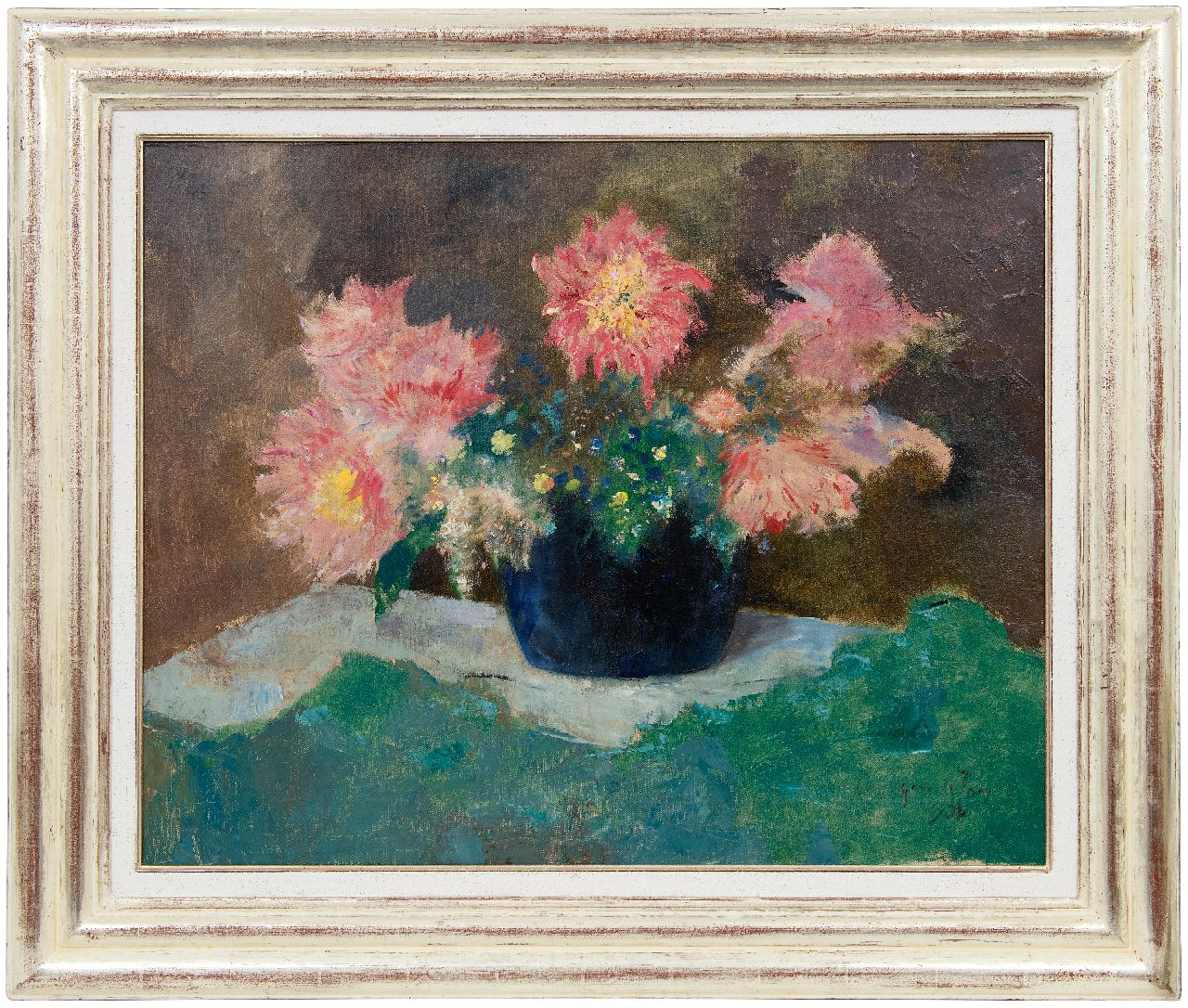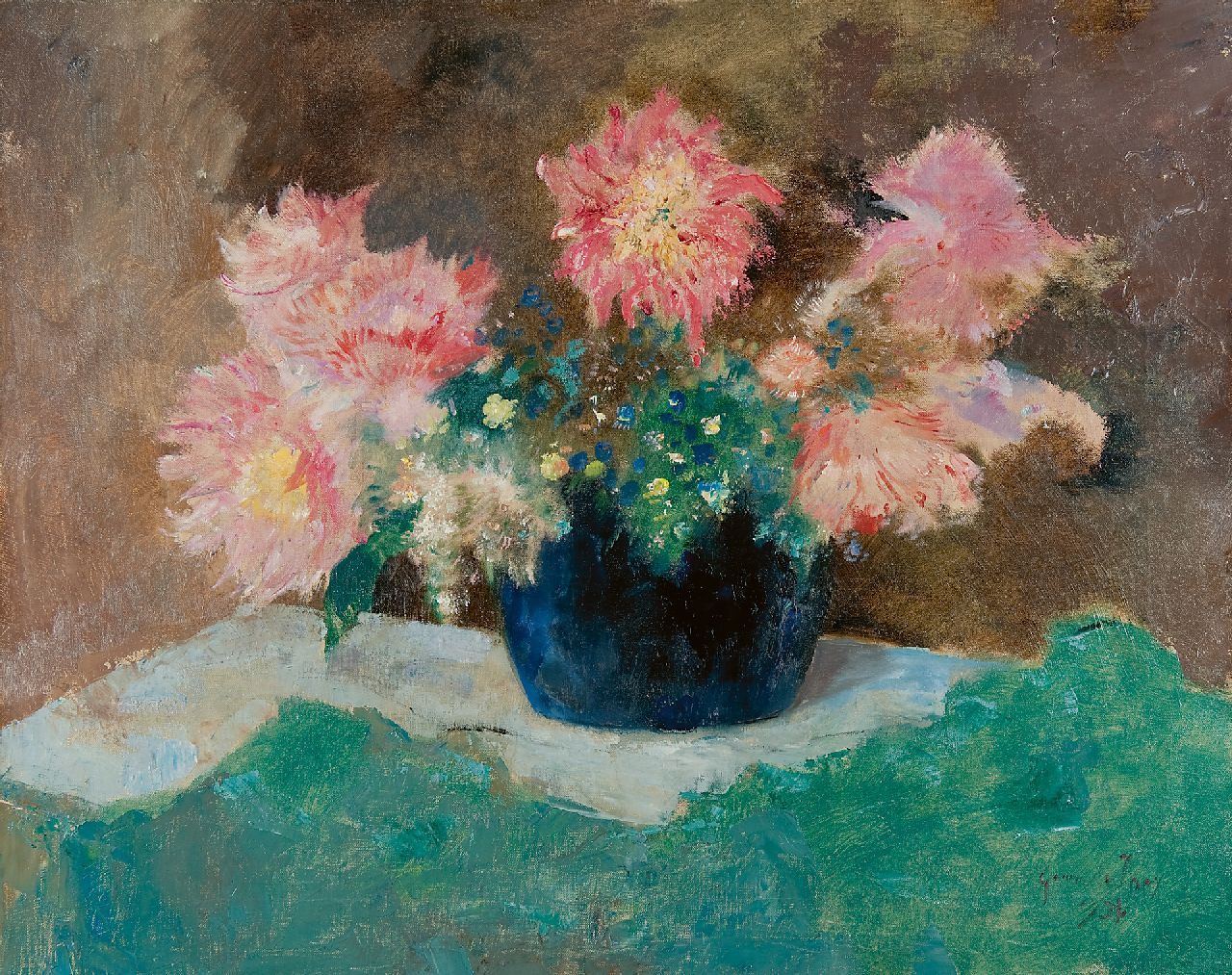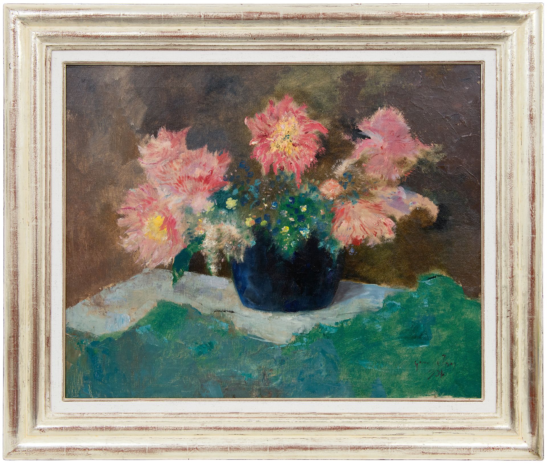 Germ de Jong kunstwerk • schilderij • voorheen te koop Dahlia's in blauwe vaas