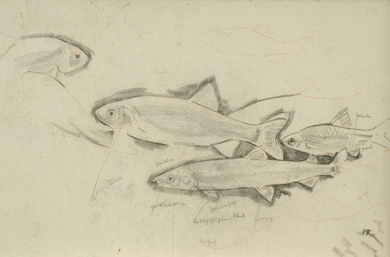Dijsselhof G.W.  | Gerrit Willem Dijsselhof, Studie van forellen, zwart krijt op papier 26,5 x 40,1 cm