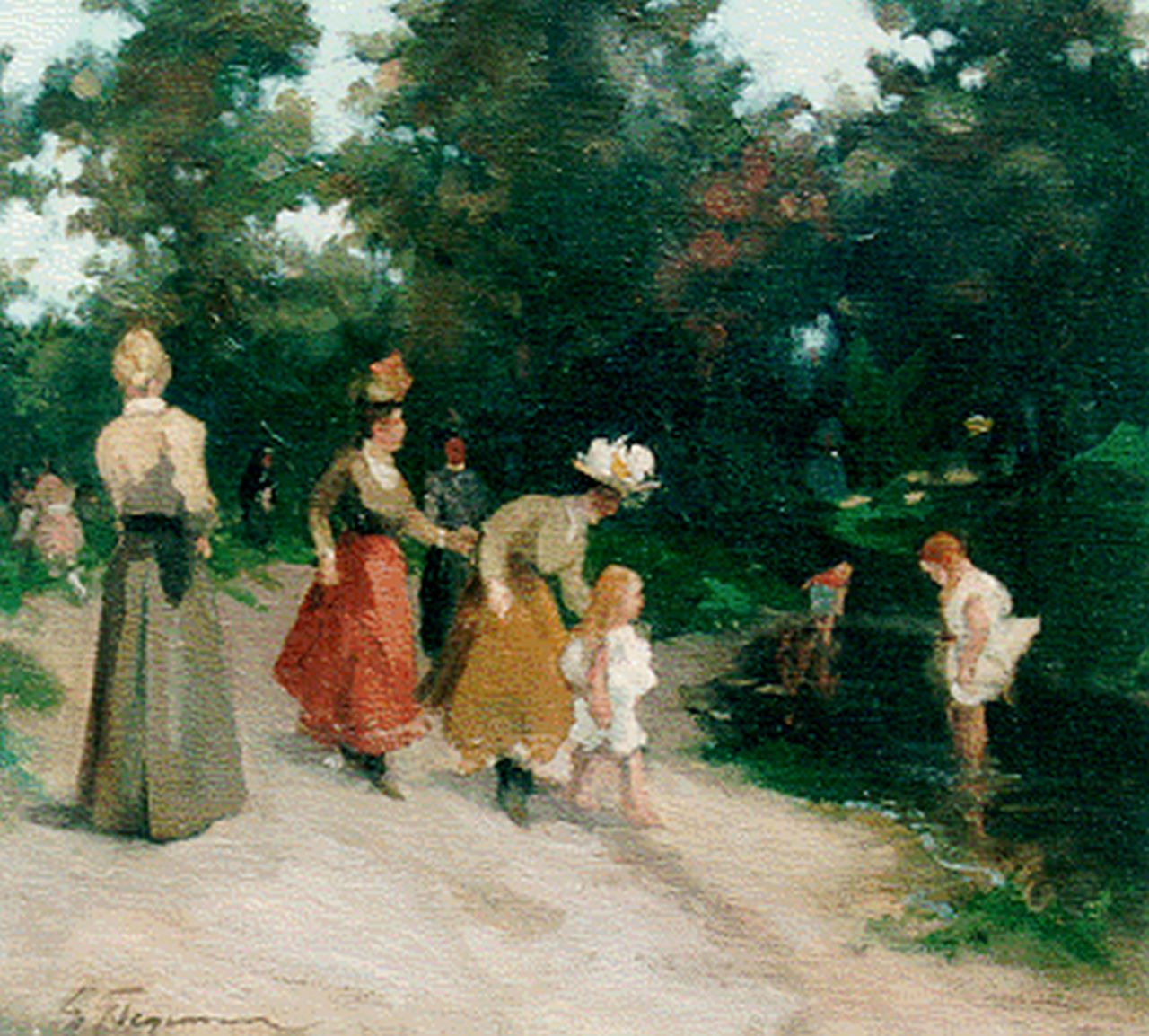 Stegeman G.  | Gerrit 'Gert' Stegeman, Vrouwen en kinderen bij de parkvijver, olieverf op doek 32,4 x 36,0 cm, gesigneerd linksonder