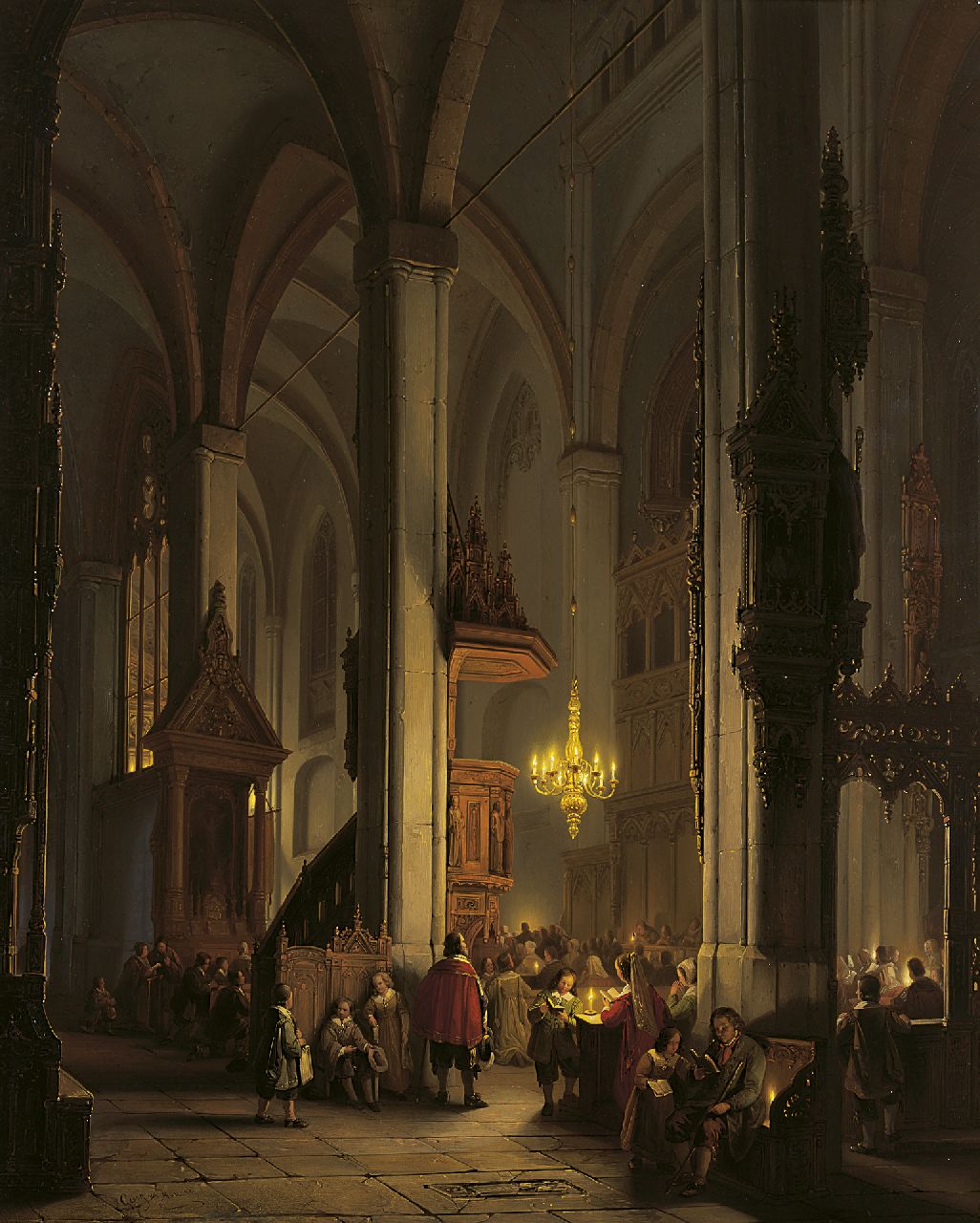 Gillis Haanen kunstwerk • schilderij • voorheen te koop Avonddienst in een gotische kerk