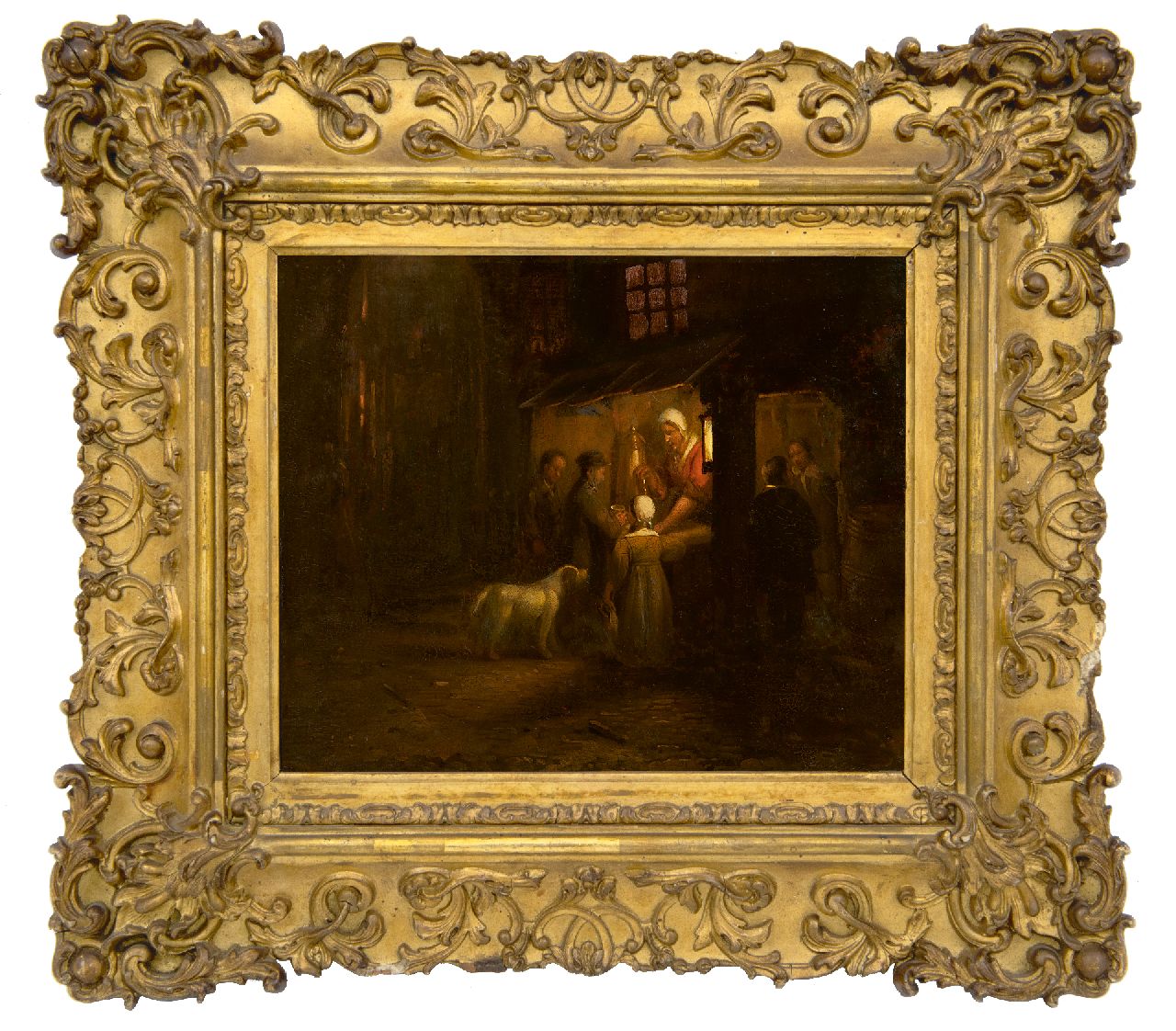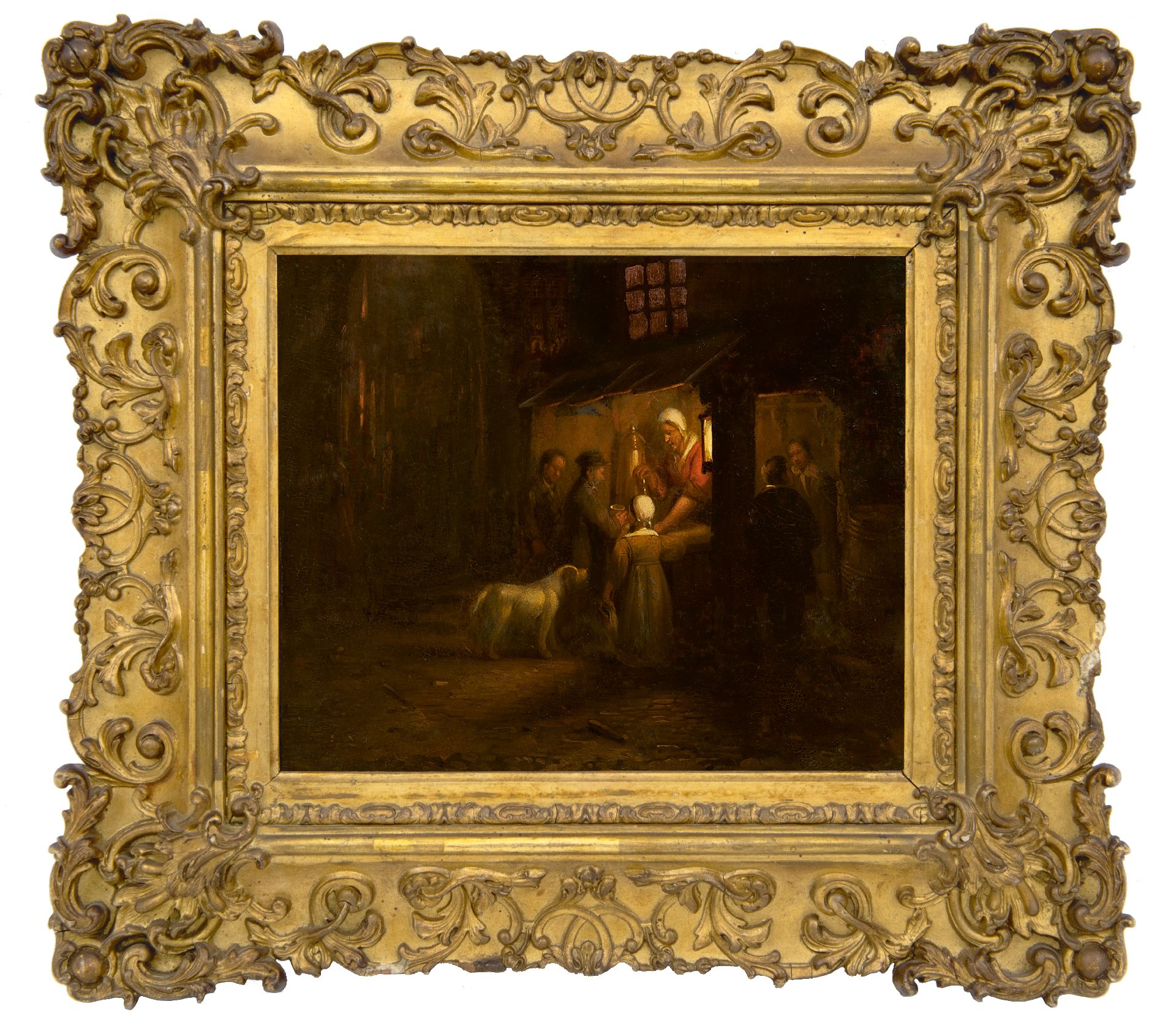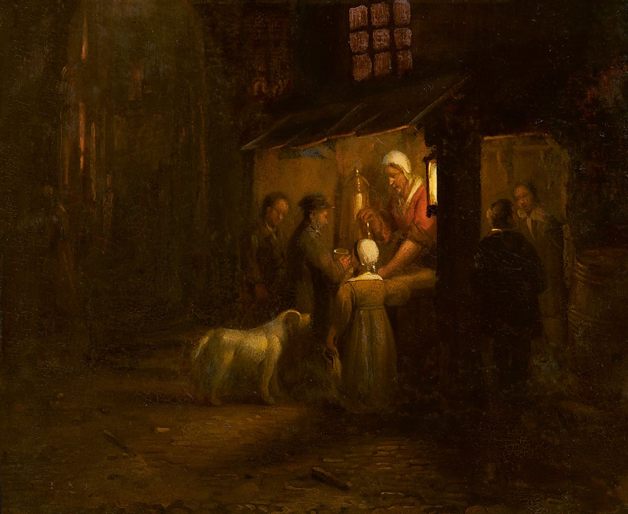 Gillis Haanen kunstwerk • schilderij • te koop Marktkraam met figuren bij kaarslicht