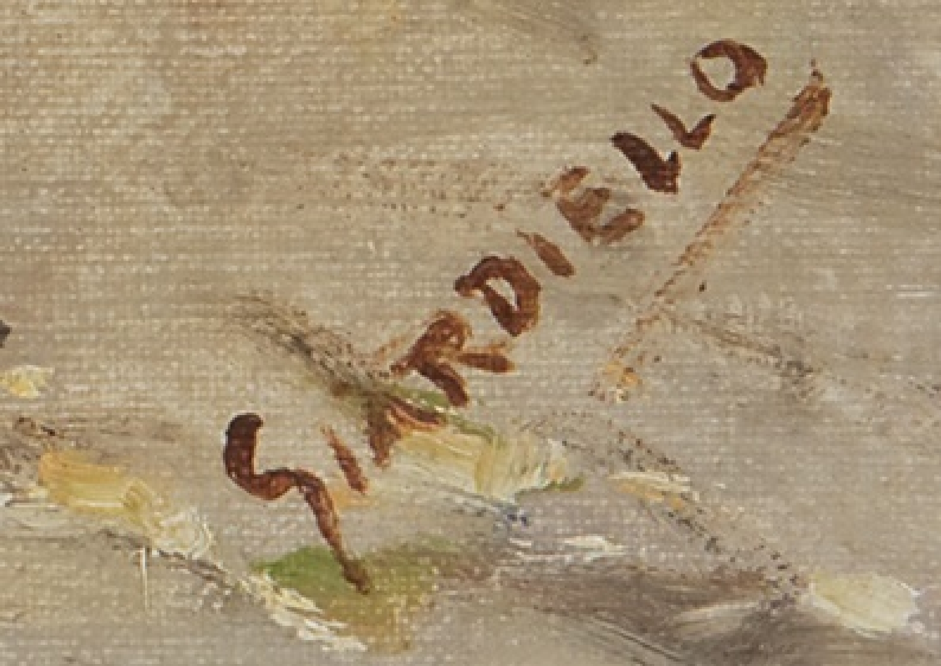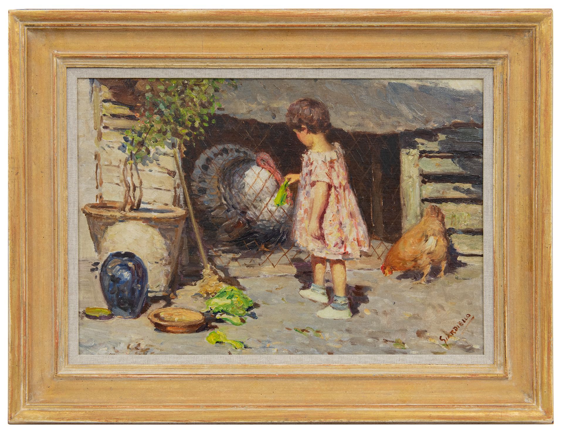 Giuseppe Giardiello werd in 1887 in het Italiaanse Napels geboren. Over het leven van de schilder en zijn opleiding is weinig bekend. Zijn oeuvre bestaat voornamelijk uit impressionistische landschappen en stadsgezichten, waarin hij het alledaagse leven van de mensen afbeeldde. Ook dieren keren regelmatig terug in zijn werk. Dit schilderij van een meisje met een kalkoen is daar een voorbeeld van. Daarnaast kenmerkt zijn werk zich door een licht kleurenpalet.