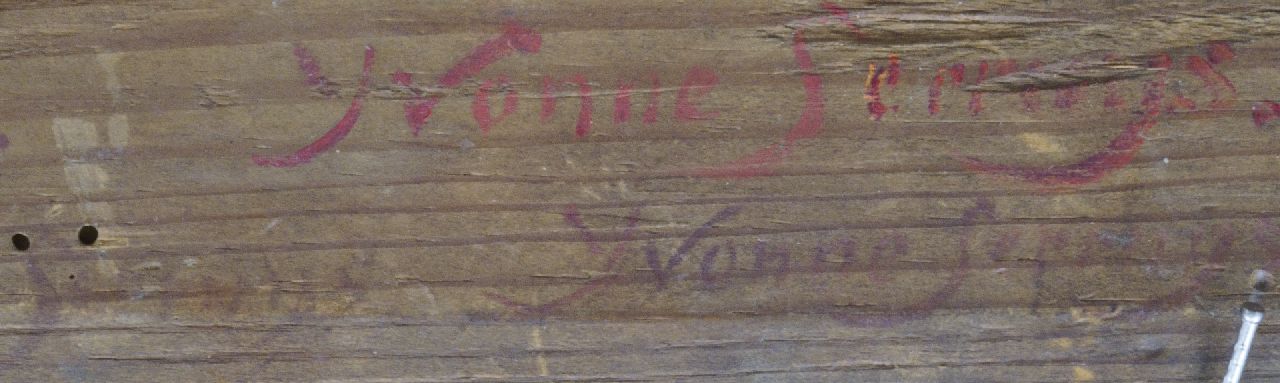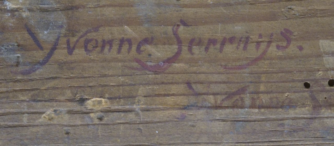 annotatie: op spieraam meerdere malen voorzien van naam en initialen van de schilderes en beeldhouwster Yvonne Serruys (1873-1953).
