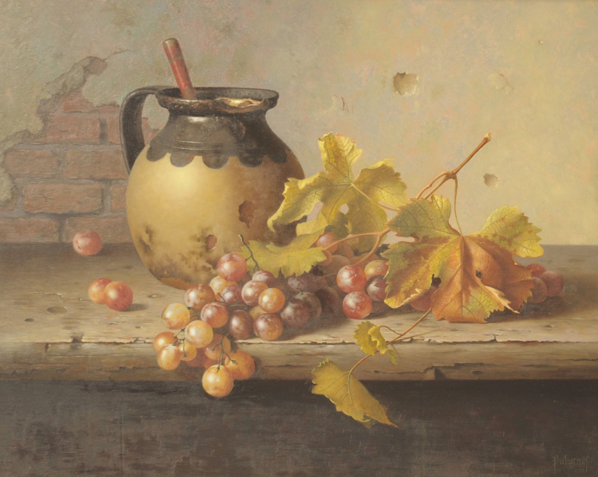 Gyula Bubarnik kunstwerk • schilderij • voorheen te koop Stilleven van kan met druiven