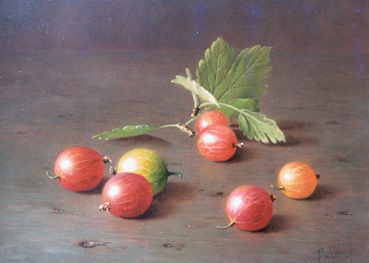 Bubarnik G.  | Gyula Bubarnik, Stilleven van kruisbessen, olieverf op paneel 13,0 x 18,0 cm, gesigneerd rechtsonder