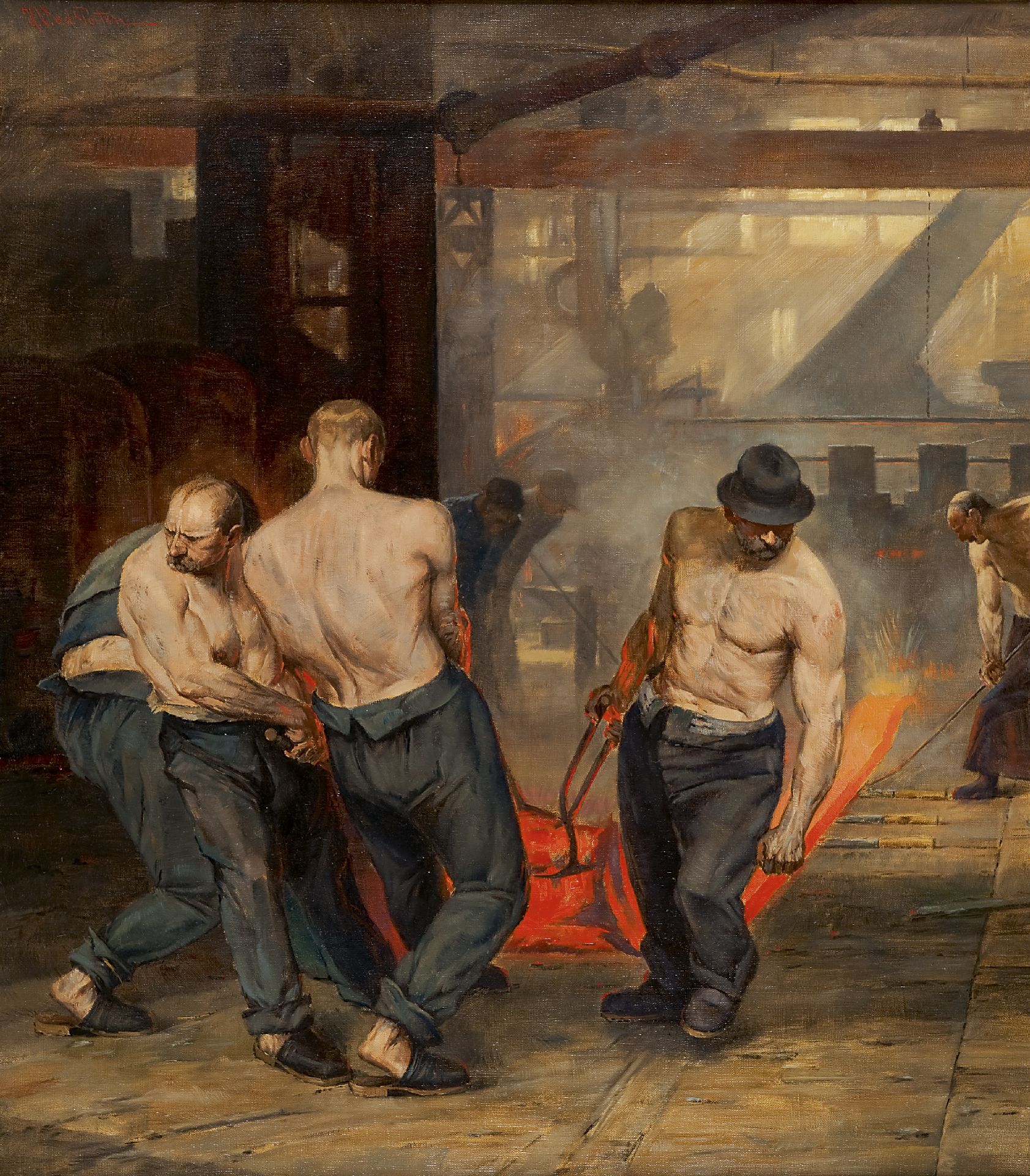 Porten H.V. v.d. | H.V. v.d. Porten, Arbeiders in een staalwalserij, olieverf op doek 80,2 x 70,2 cm, gesigneerd linksboven